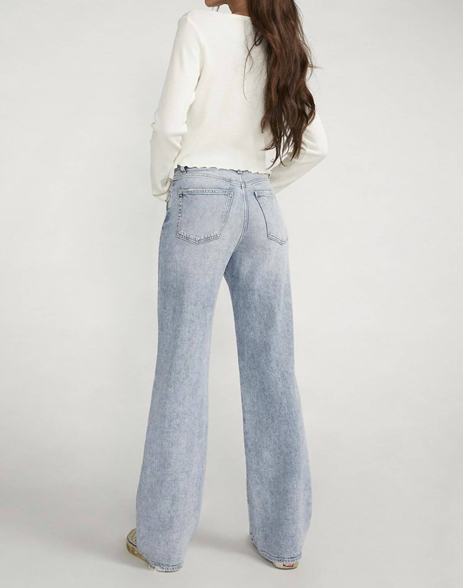 High-waist is here to stay and we especially love this style. Embrace timeless style with the highly desirable High Rise Trouser Leg Jeans by Silver Jeans Co, crafted in classic indigo. Featuring a high-rise waist and relaxed fit, these jeans boast a flared leg for a nod to 90s fashion. With a solid pattern and practical 5-pocket styling, they offer both fashion and function. Composition: Cotton Blend. Closure: Button closure. Care: Machine wash and tumble dry.