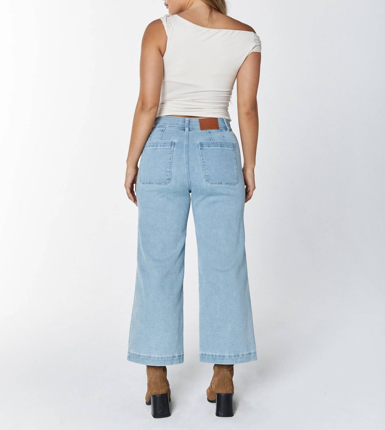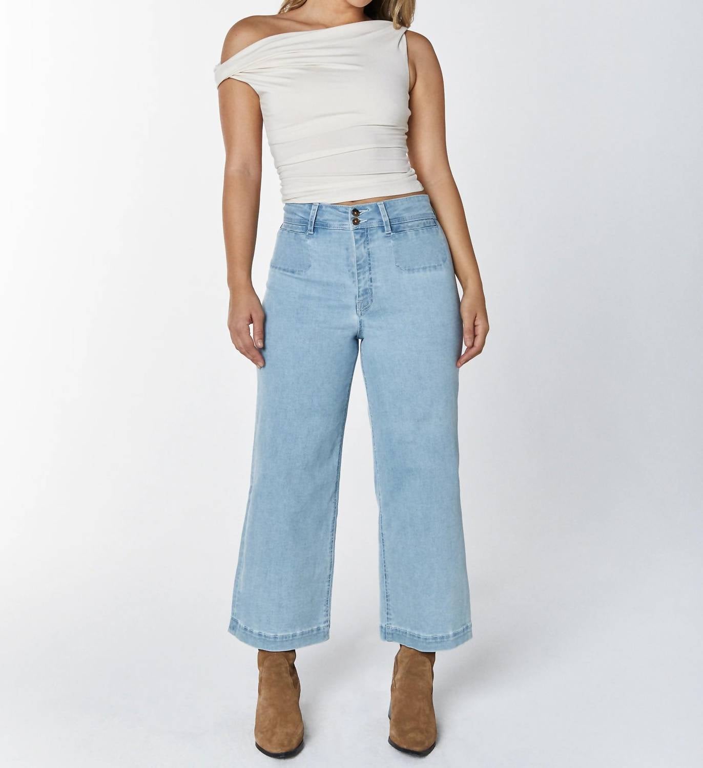 High-waist is here to stay and we especially love this style. Discover the Gemma High-rise Mod Sailor Jean by Unpublished in a stylish Stone wash, perfect for a chic streetwear look. These high-rise jeans feature a classic fit with a wide-leg style and a flattering cropped length. Carefully crafted from a 98% cotton and 2% spandex stretch twill blend, they provide just the right amount of movement and comfort. Closure: Double sew-on buttons with a zip fly. Care: Machine wash cold with like colors, do not bleach, tumble dry low, and low iron if needed. Size 27 specifications include a front rise of 12 inches, a leg opening of 22 inches, and an inseam of 26 inches. Model is 5'9" and wearing a size 26.