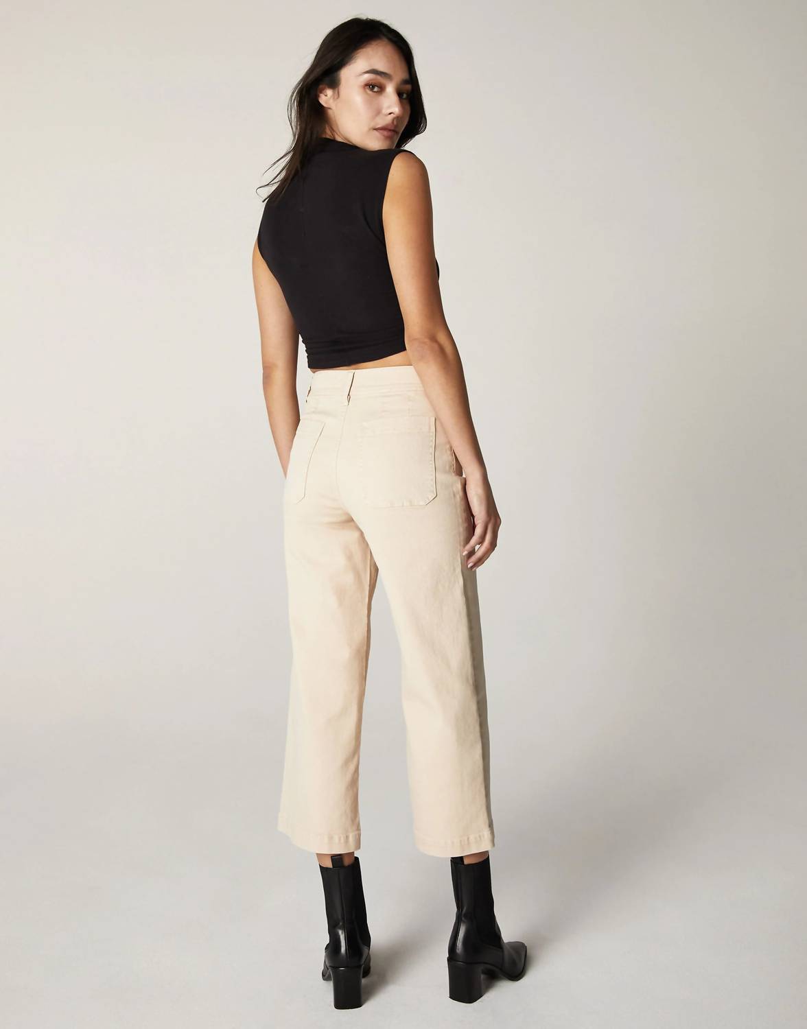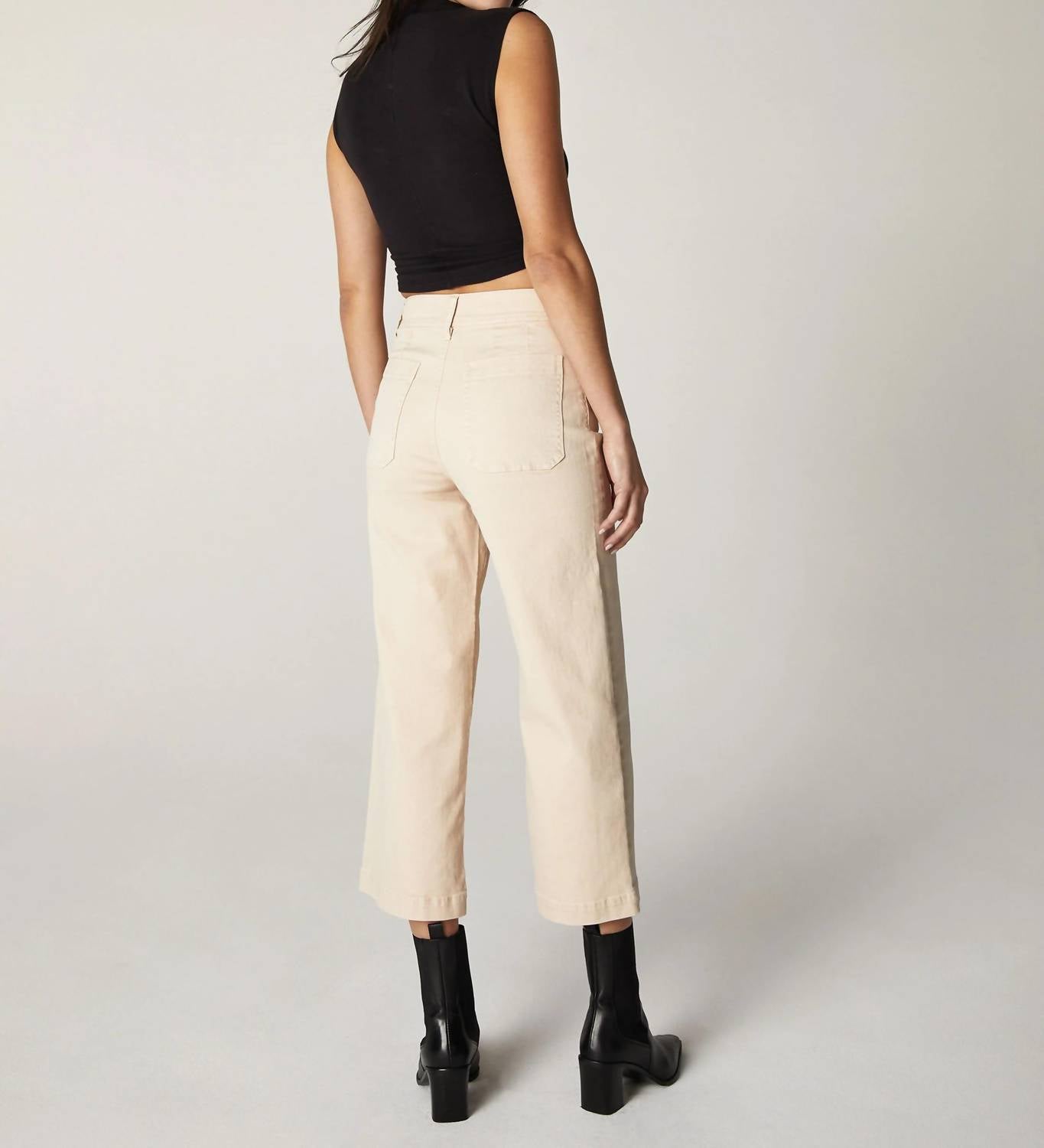 High-waist is here to stay and we especially love this style. Discover the Gemma High-rise Mod Sailor Jean by Unpublished in a stylish Stone wash, perfect for a chic streetwear look. These high-rise jeans feature a classic fit with a wide-leg style and a flattering cropped length. Carefully crafted from a 98% cotton and 2% spandex stretch twill blend, they provide just the right amount of movement and comfort. Closure: Double sew-on buttons with a zip fly. Care: Machine wash cold with like colors, do not bleach, tumble dry low, and low iron if needed. Size 27 specifications include a front rise of 12 inches, a leg opening of 22 inches, and an inseam of 26 inches. Model is 5'9" and wearing a size 26.