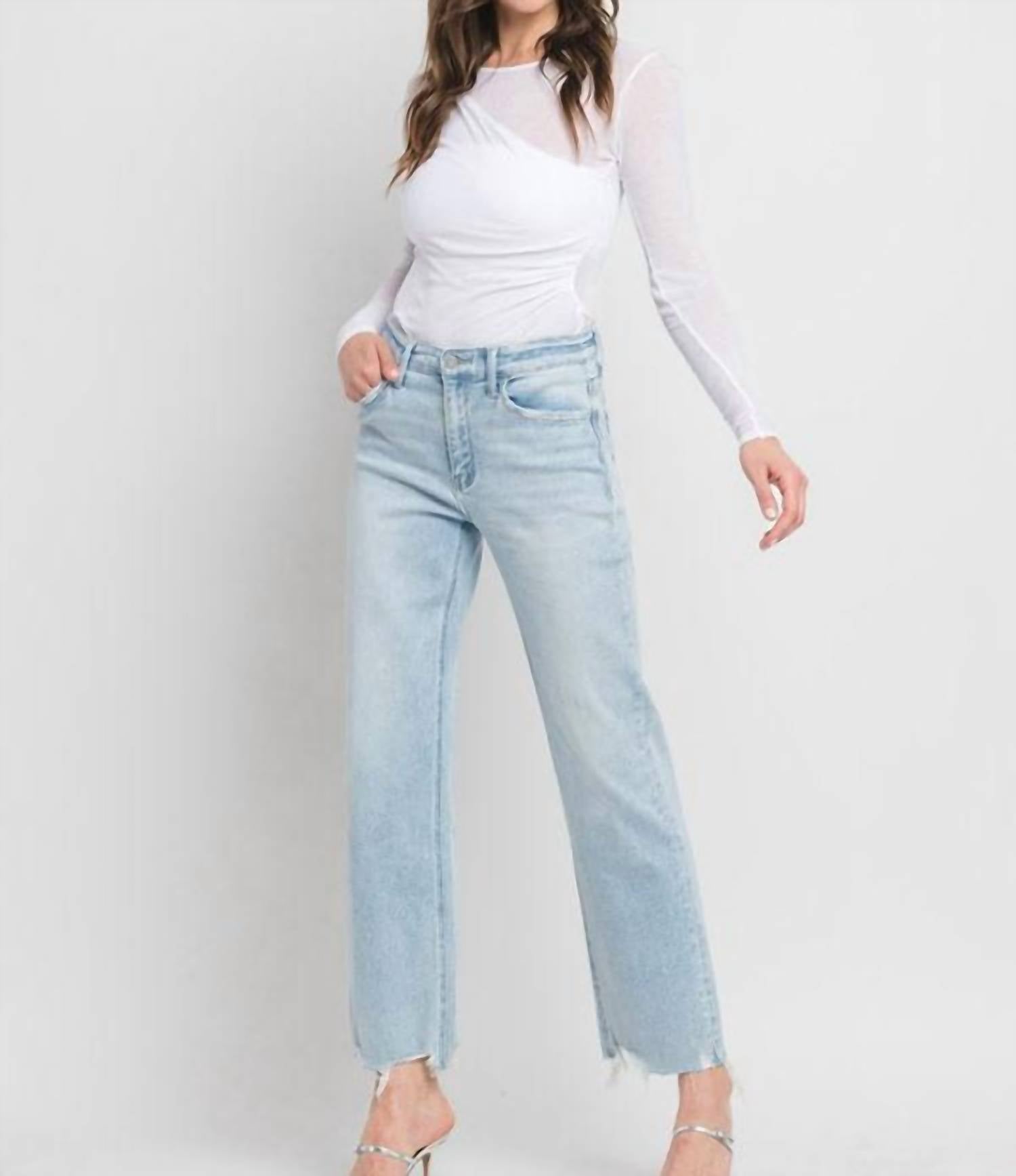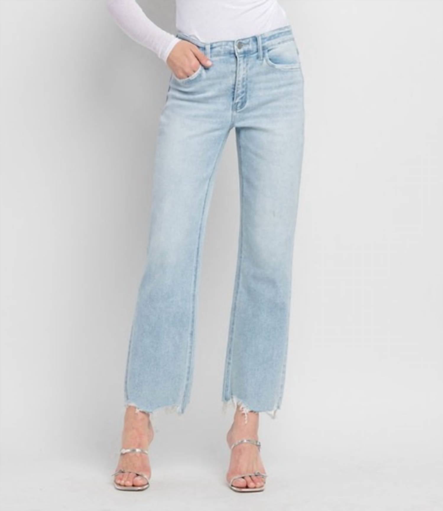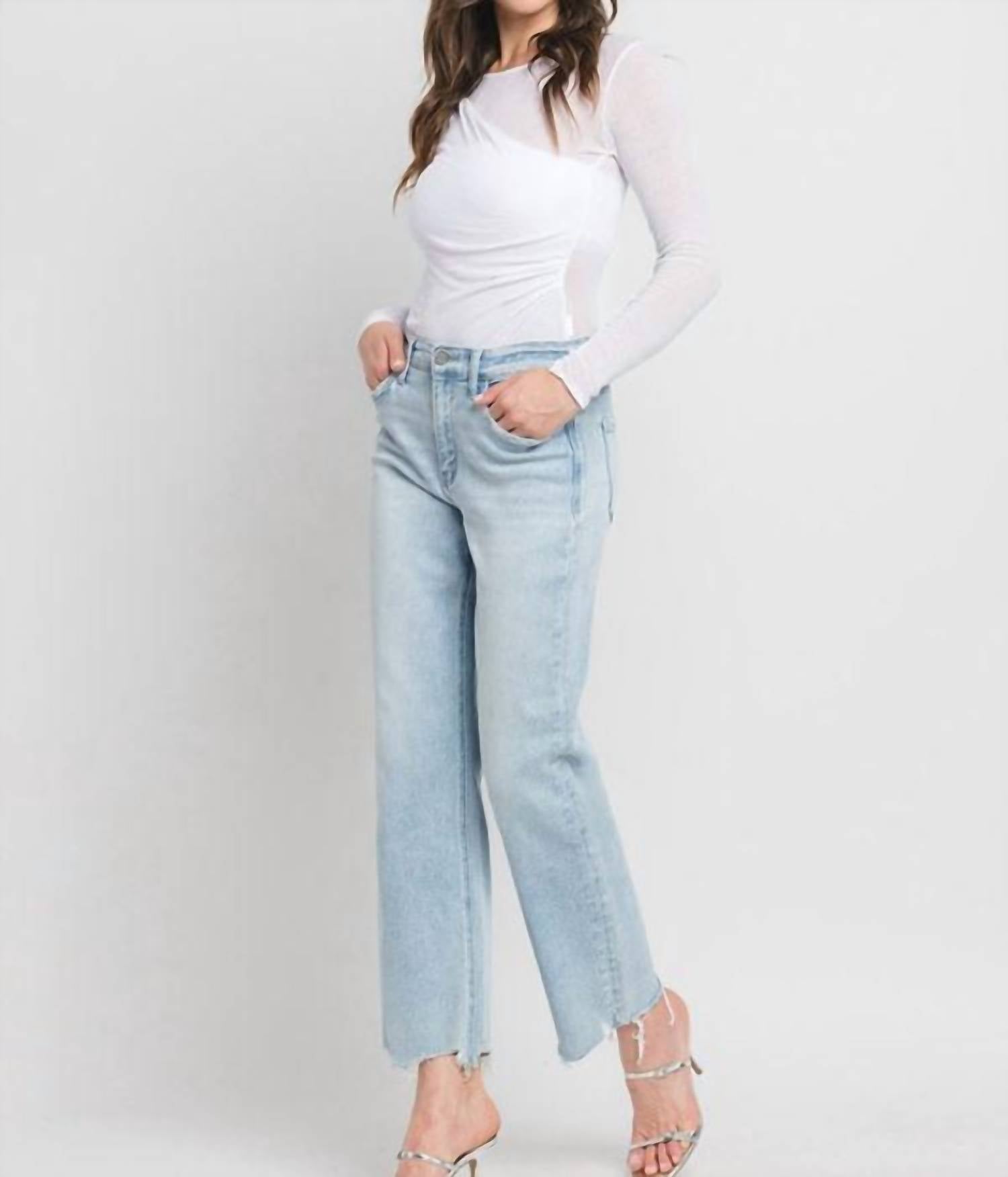 Introducing the Ava Slim Wide Jeans by VERVET BY FLYING MONKEY, crafted in a light wash blue to complement your minimalist fall wardrobe. These high-rise jeans feature a slim fit with a wide leg, raw hem detailing, and a comfortable stretch, making them perfect for Thanksgiving travel occasions.