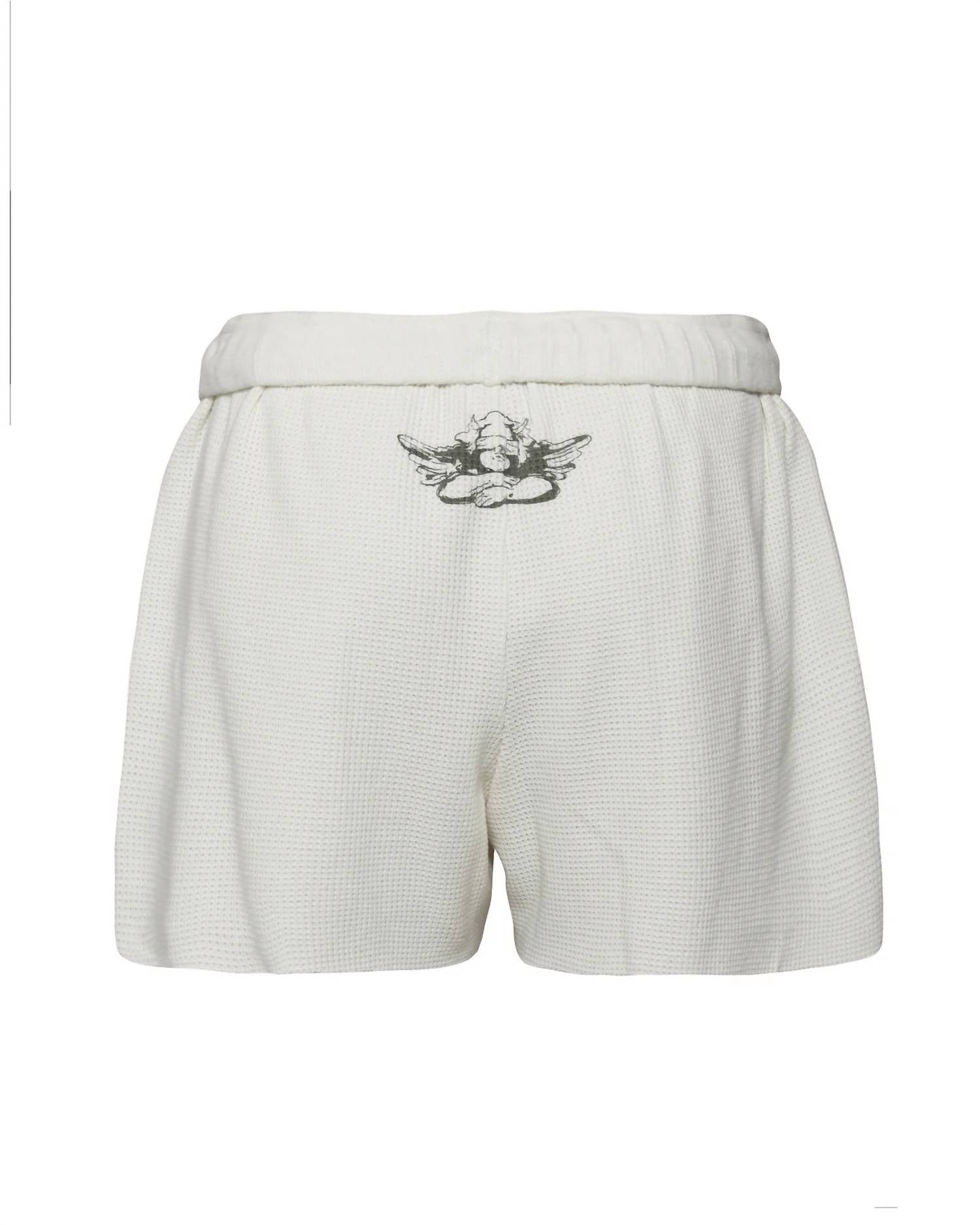 High-waist is here to stay and we especially love this style short. Meet the Cadet Basic Short by BOYS LIE, a playful addition to your spring streetwear collection. Crafted in breathable ivory white waffle fabric, these shorts feature a lively rhinestone cherub and bold graphic details for a flirty edge. Composition: 68% Polyester, 29% Rayon, 3% Spandex. Closure: Pull on. Care instructions: Machine wash cold with like colors and tumble dry low. Suitable for travel and casual occasions, these high-waist shorts offer both style and comfort.