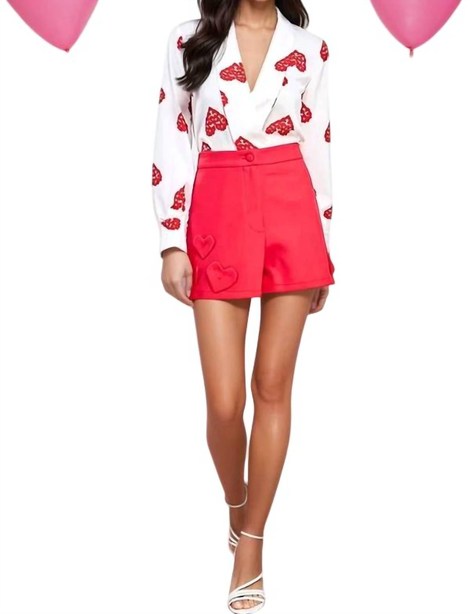 High-waist is here to stay and we especially love this style short. Crafted from a blend of 94% Polyester and 6% Spandex. These vibrant red high-waist shorts feature delightful 3D heart appliqués for a romantic flair. Designed for comfort, they offer functional side pockets, an elasticized back, and a front zipper with a covered button closure. Care requirements include machine washing cold, avoiding bleach, and line drying for longevity. Imported from China, they maintain a true-to-size fit.