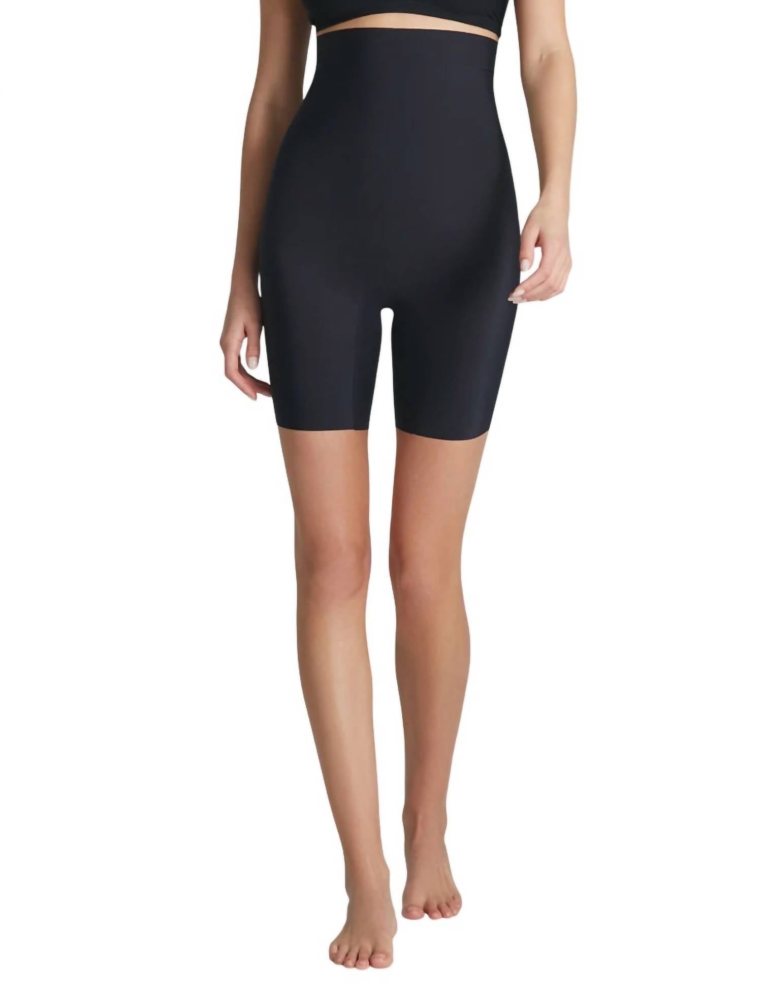 High-waist is here to stay and we especially love this style short. Experience the ultimate blend of comfort and style with the Zone Smoothing High-Waisted Short by Commando, crafted in sleek black nylon blend. This high-waisted short features a luxury microfiber composition of 70% nylon and 30% elastane, offering medium compression for a flattering silhouette. Enjoy the benefits of four-way stretch, high fabric breathability, and a raw-cut hem, all while the 100% cotton gusset ensures optimal comfort. Perfect for fitness or athleisure, these pull-on shorts are pilling-resistant, ultra-soft, and designed to enhance your curves without constricting movement.