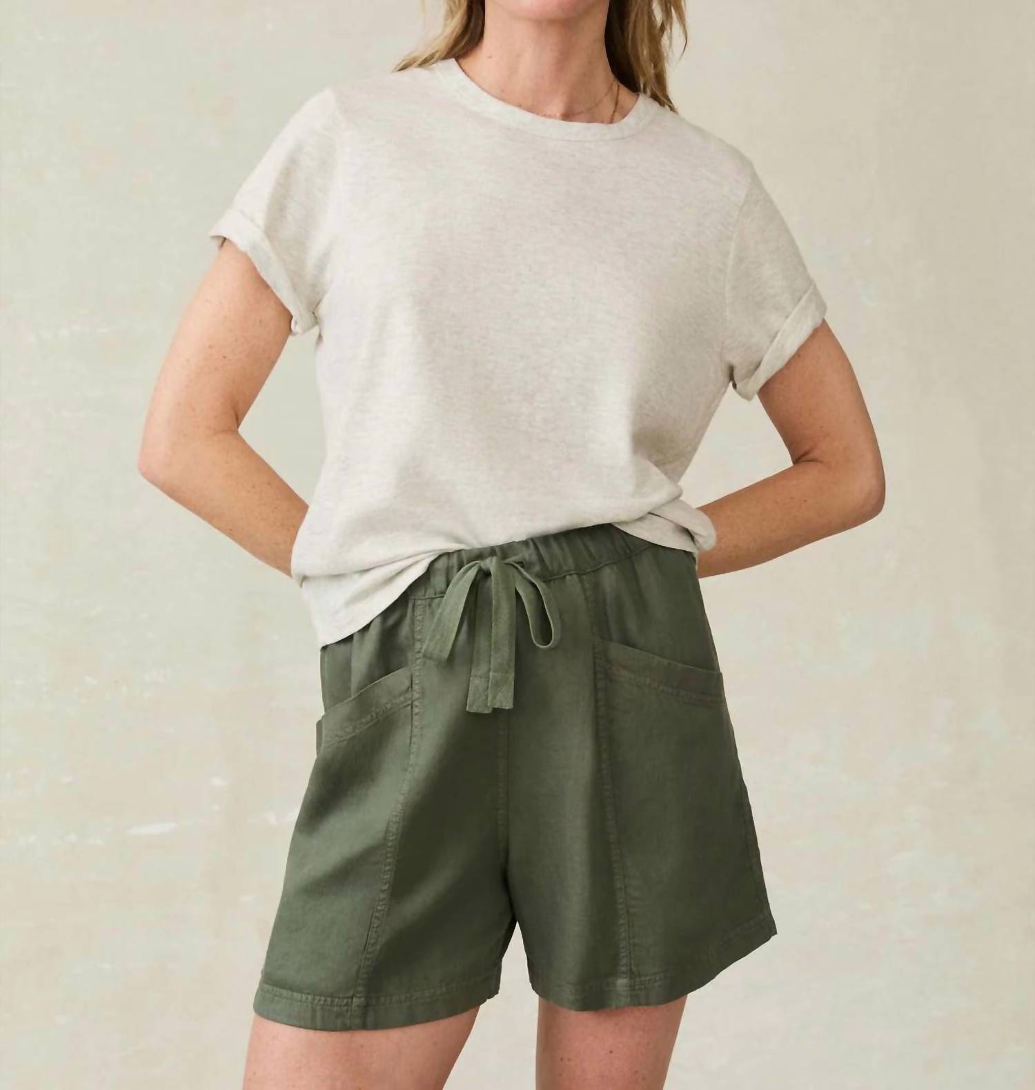 Fit to perfection, we love these high-waist shorts and you will too. Introducing the Faherty Topanga Drape Short in a refreshing Thyme hue, crafted from a breathable blend of 55% TENCEL™ Lyocell, 22% Linen, 21% Organic Cotton, and 2% Elastane. Designed with a relaxed fit and a 4½" inseam, these high-waist shorts feature an encased elastic waistband with a cotton tape tie closure at the center front, and practical patch pockets at the front. Care is effortless: turn inside out and machine wash cold on a gentle cycle, then lay flat to dry. Model Edda, standing 5'10", dons a size Medium.