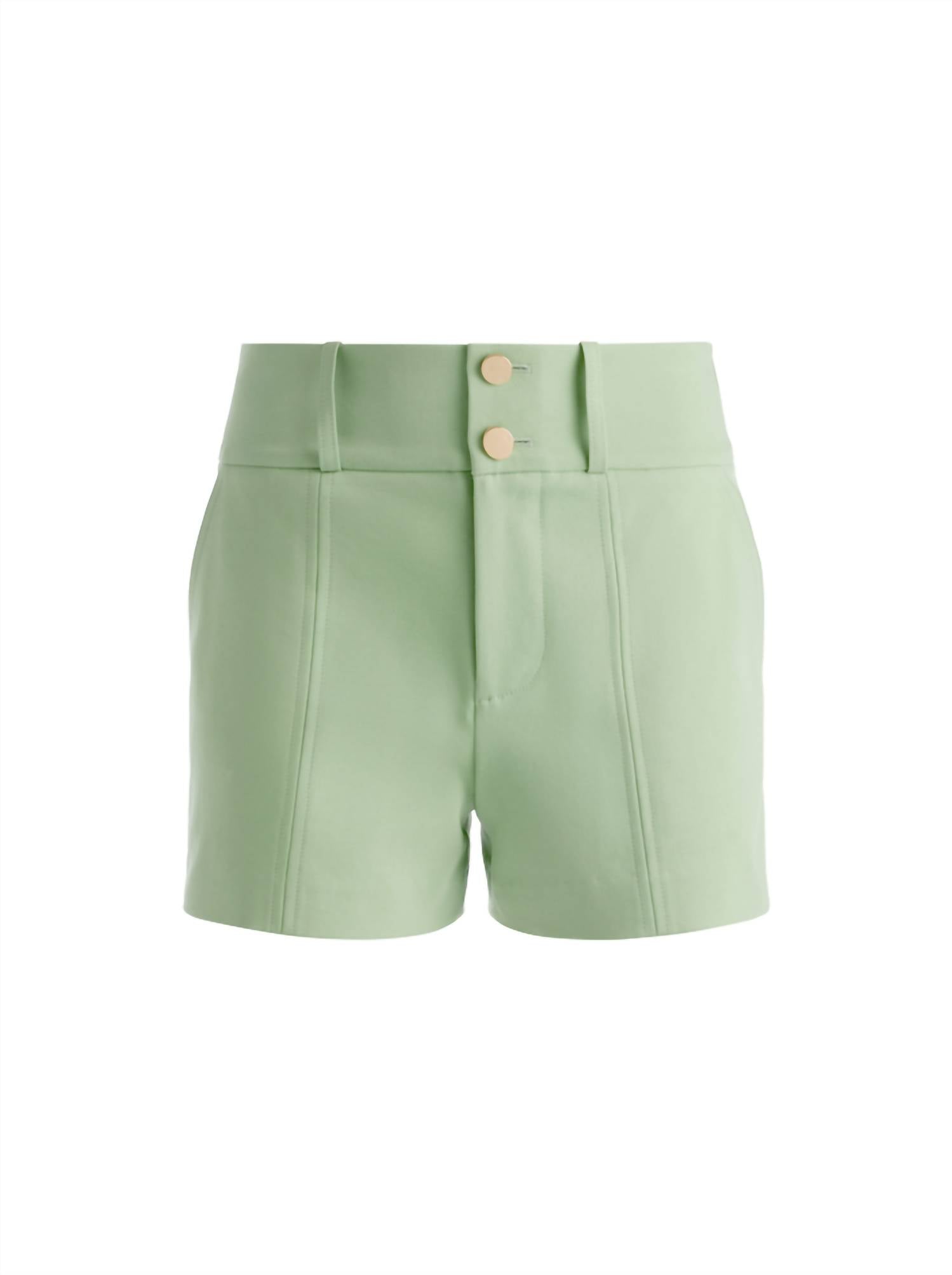 Fit to perfection, we love these high-waist shorts and you will too. Elevate your summer wardrobe with the Mame Short by alice + olivia, crafted from luxe sage cotton sateen for a minimalist and elegant look. These high-waisted mini shorts feature a wide waistband and a double button front closure for a sleek silhouette. Composition: 74% Cotton, 23% Nylon, 3% Elastane. Care: Dry clean only. Imported. Model is 5'10" and wears size 0. Front rise: 11 1/4", Inseam: 3". Fits true to size. Perfect for holiday parties or St. Patrick's Day celebrations.