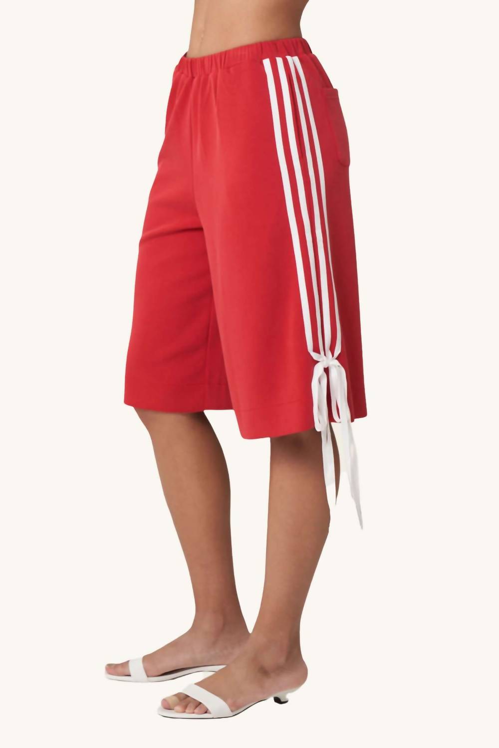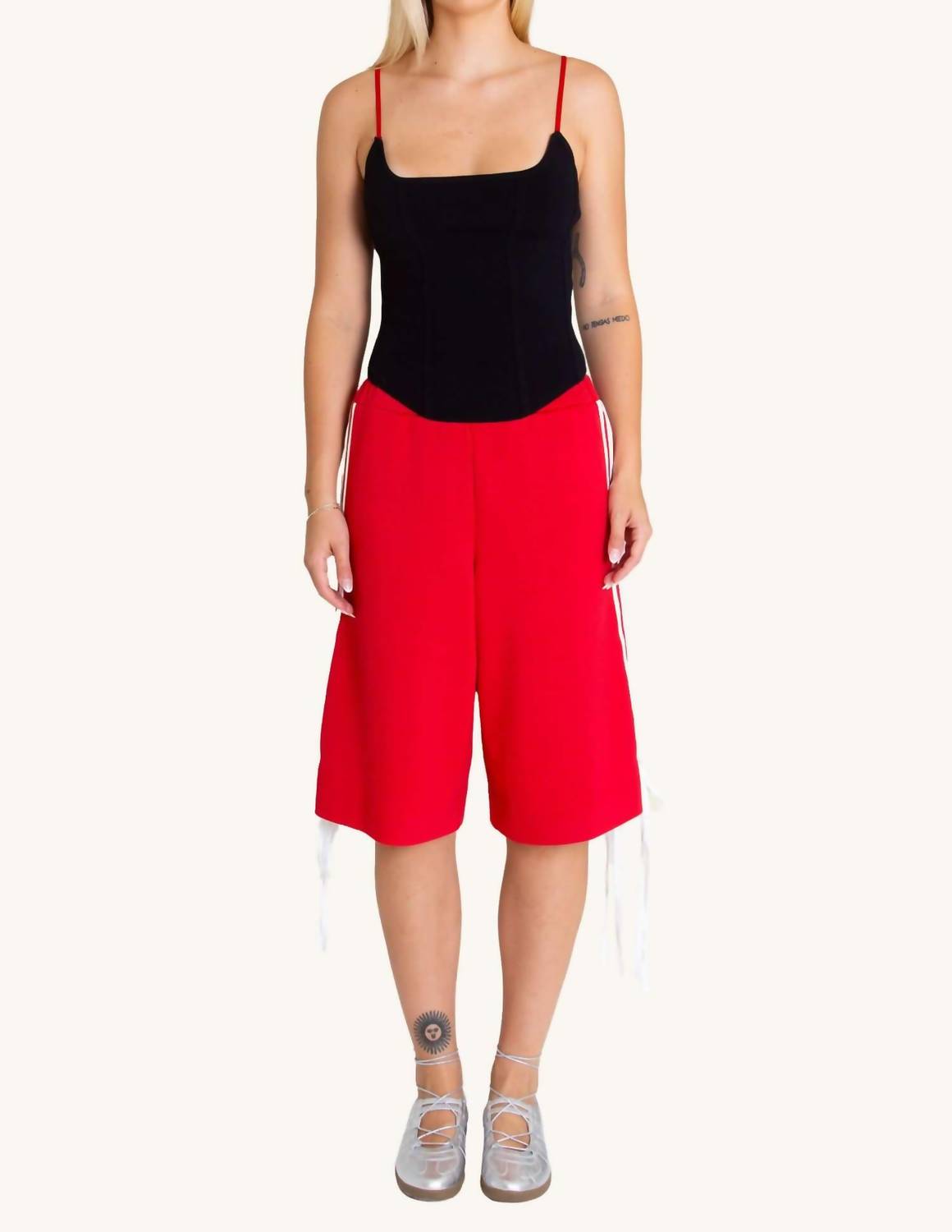 Fit to perfection, we love these high-waist shorts and you will too. Discover the Bow Jort by Find Me Now, a stylish high-waist piece in vibrant red, perfect for all your summer travels. Expertly crafted from eco-friendly recycled fabric, polyester, and elastane, this solid-pattern jort is designed for comfort and sustainability. The convenient pull-on closure makes it easy to wear, while the lack of pockets ensures a sleek silhouette. For lasting wear, hand wash and line dry this streetwear staple, ideal for celebrating the 4th of July or any warm-weather occasion.