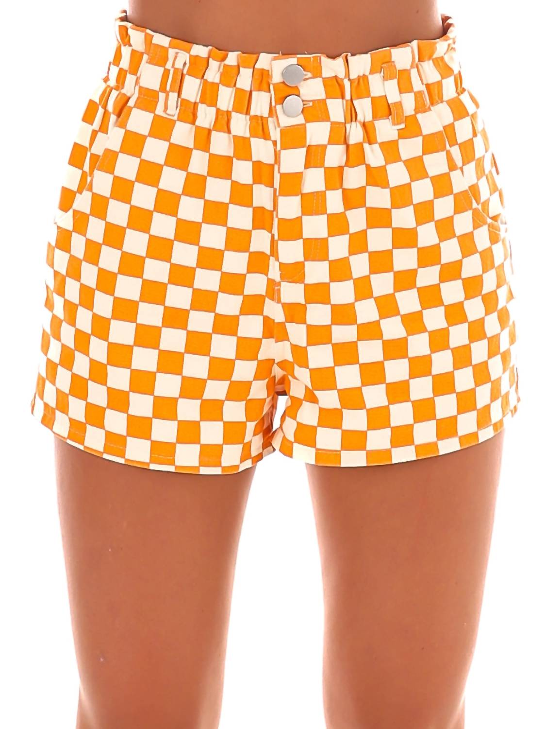 High-waist is here to stay and we especially love this style short. Elevate your holiday wardrobe with the Checker Spirit Shorts by day + moon, designed for women who love a minimalist, patterned style. These high-waist shorts in a vibrant Sunkist hue are perfect for spring occasions, featuring a playful checker pattern and convenient pockets. With a comfortable elastic waistband and button closure, they're ideal for casual gatherings or a Thanksgiving celebration. For best care, hand wash and lay flat to dry.