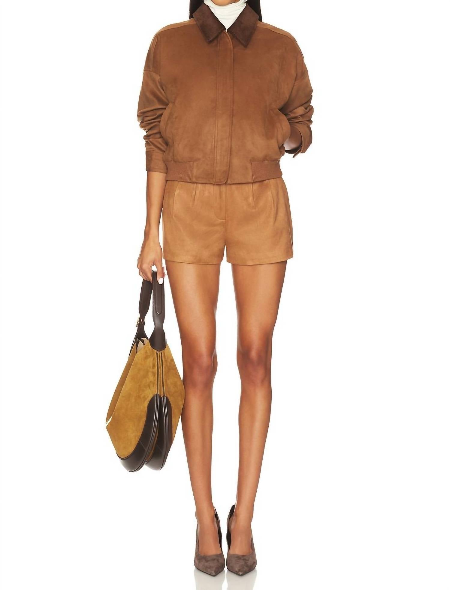 Tuck your favorite tee into these high-waist shorts for a more casual-cool feel. Elevate your spring wardrobe with the Jude High Waist Shorts by ASTR, crafted in camel-colored faux suede. These classic fit shorts feature a pleated front design, adding a touch of sophistication to your minimalist look. Designed with functional side seam pockets and equipped with a concealed zipper and flat hook closure, these shorts are as practical as they are stylish. With a blend of 92% polyester and 8% elastane, these midweight shorts are fully lined for comfort and must be dry cleaned. Made in China, they measure approximately 13 inches in length.