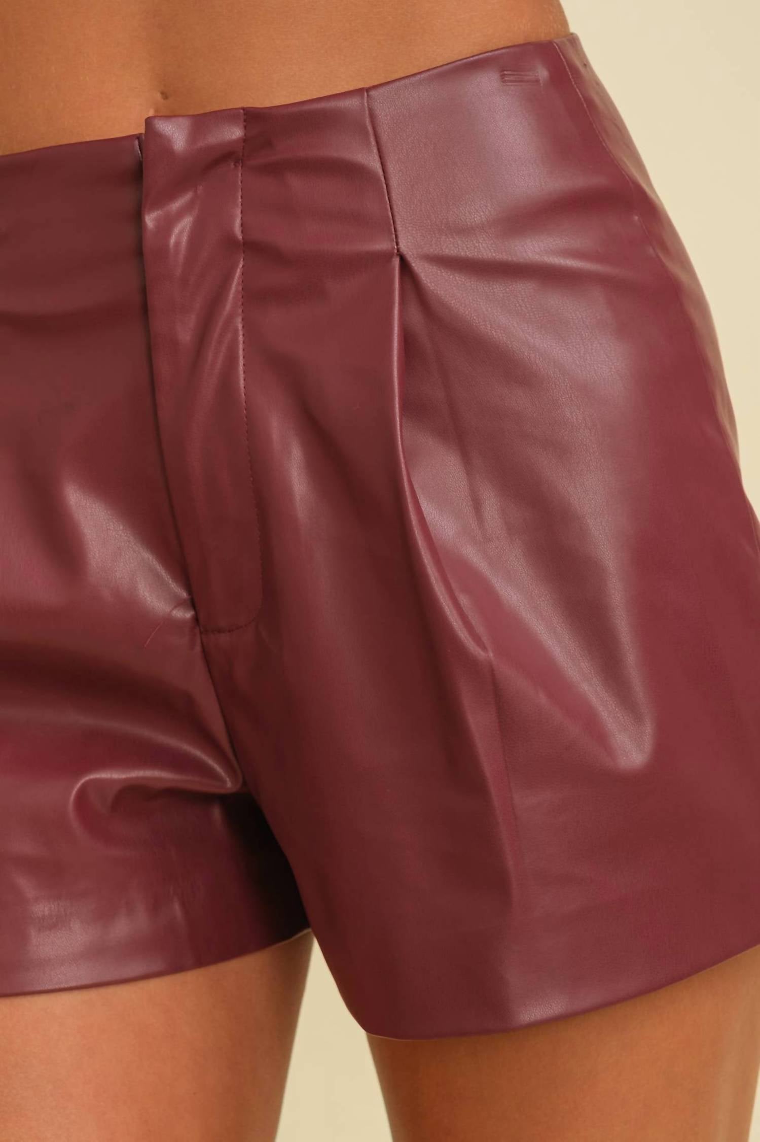 Tuck your favorite tee into these high-waist shorts for a more casual-cool feel. Elevate your wardrobe with the Cloud Ten Faux Leather Shorts in a stunning burgundy hue, an ideal choice for cocktail parties and New Year's Eve celebrations. These high-waist shorts boast a solid pattern, featuring convenient pockets and a sleek zip closure for easy wear. Composition: 50% PU, 50% polyester. Care: Dry clean only, ensuring longevity and maintaining their stylish appeal. Perfect for the Spring season, these shorts embrace the Y2K trend with a contemporary fit designed for modern women.