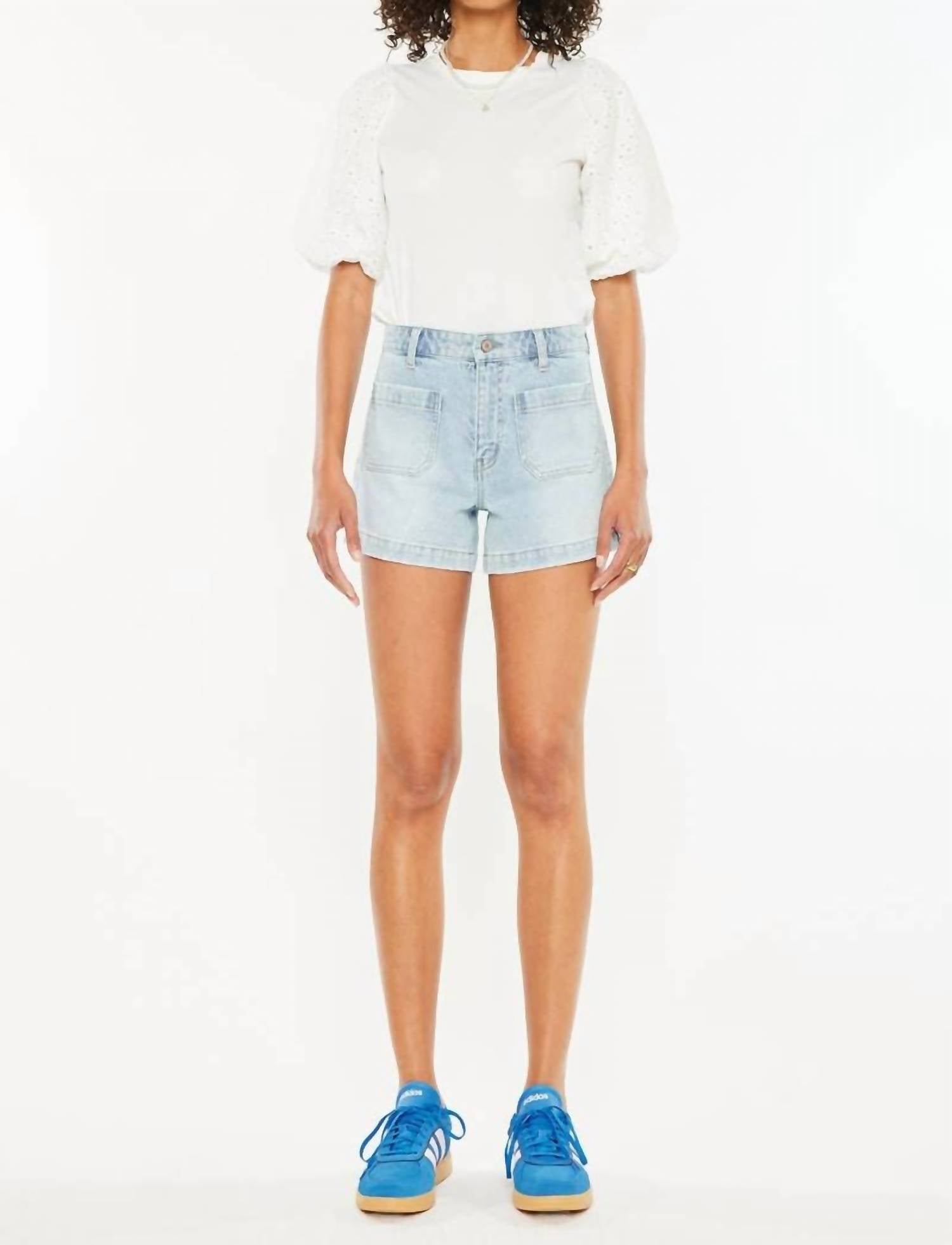 Fit to perfection, we love these high-waist shorts and you will too. Elevate your summer wardrobe with the High Rise Twila Shorts from KanCan, designed in a trendy light wash that's perfect for vacation styling. These solid pattern, high-rise denim shorts offer a comfort stretch fit, featuring front patch pockets and a 1-inch hem for casual chic appeal. Constructed from 99% cotton and 2% spandex, the shorts boast a zipper fly and efficient button closure, with a rise of 10.5 inches, 4-inch inseam, and a 1.5-inch waistband. Enjoy easy care with machine wash instructions, making these streetwear staples ideal for sunny days and holiday adventures.