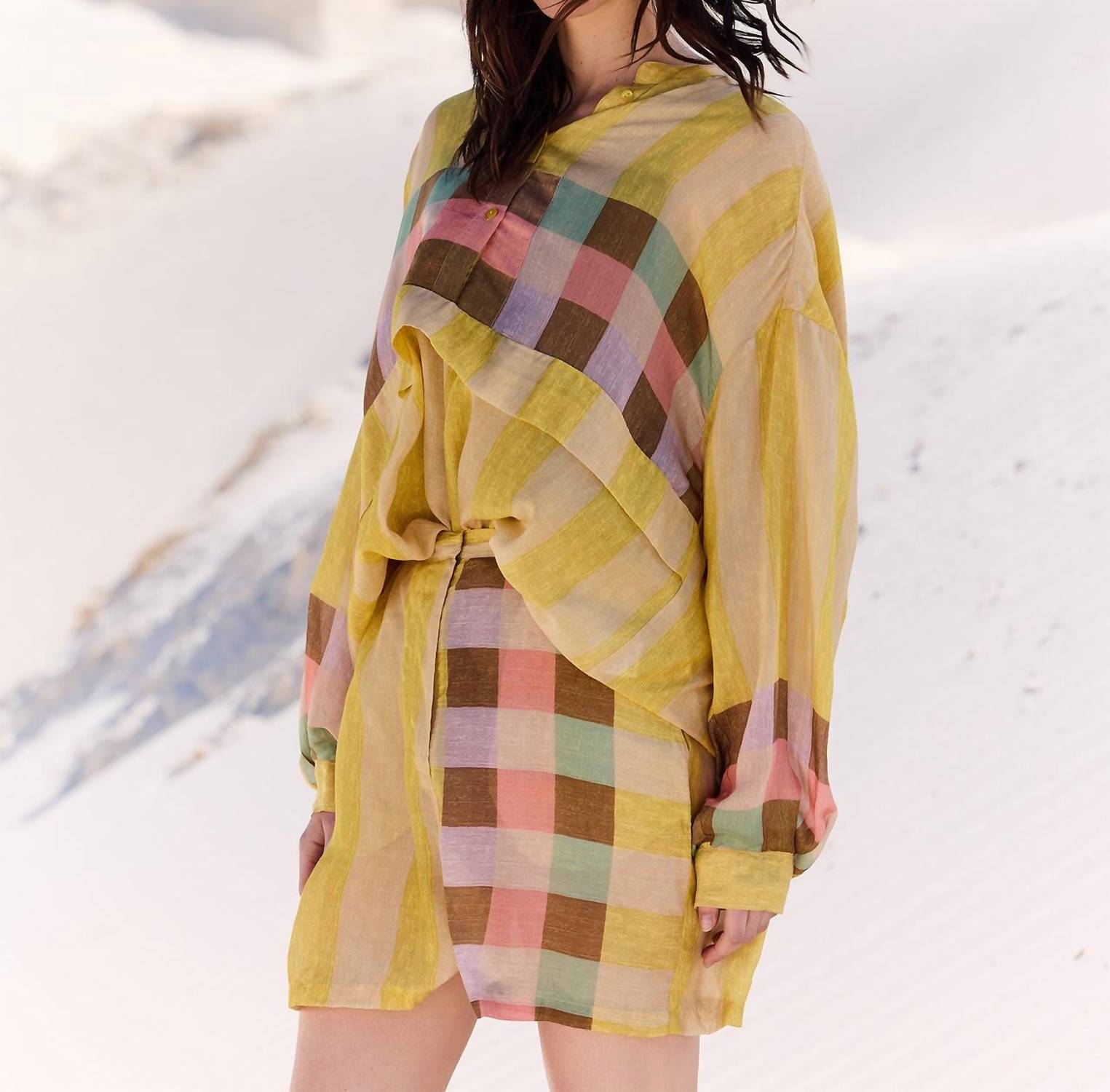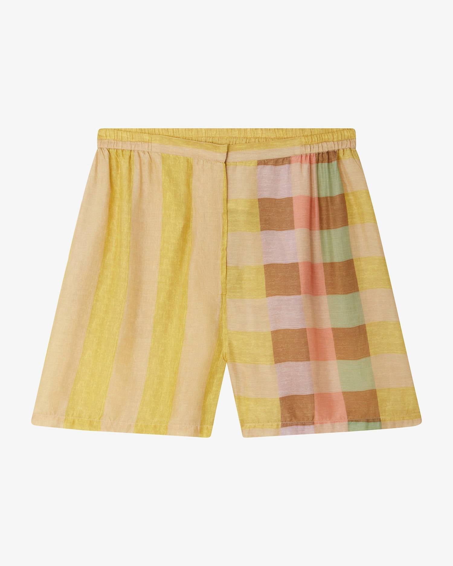Tuck your favorite tee into these high-waist shorts for a more casual-cool feel. Experience the vibrant allure of Erode Shorts by Mes Demoiselles, perfectly capturing the essence of Parisian sophistication. Designed in stunning yellow with a multicolored pattern, these shorts feature an elastic waist and convenient side pockets. The composition is a luxurious blend of 60% cupro and 40% viscose, ensuring both comfort and style. They come with a zip closure and are best cared for by hand washing and avoiding tumble drying, maintaining their maximalist appeal for your summer vacations.