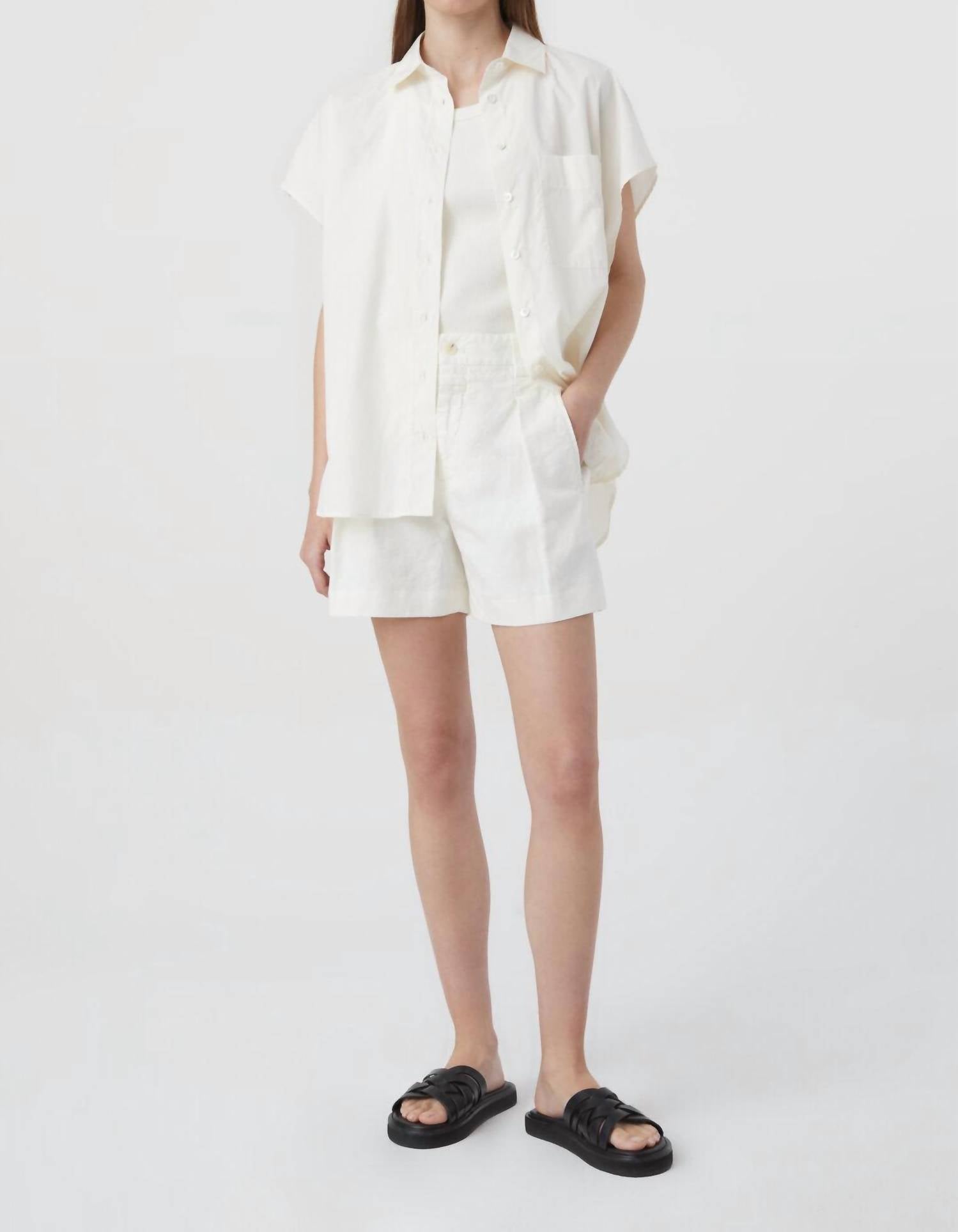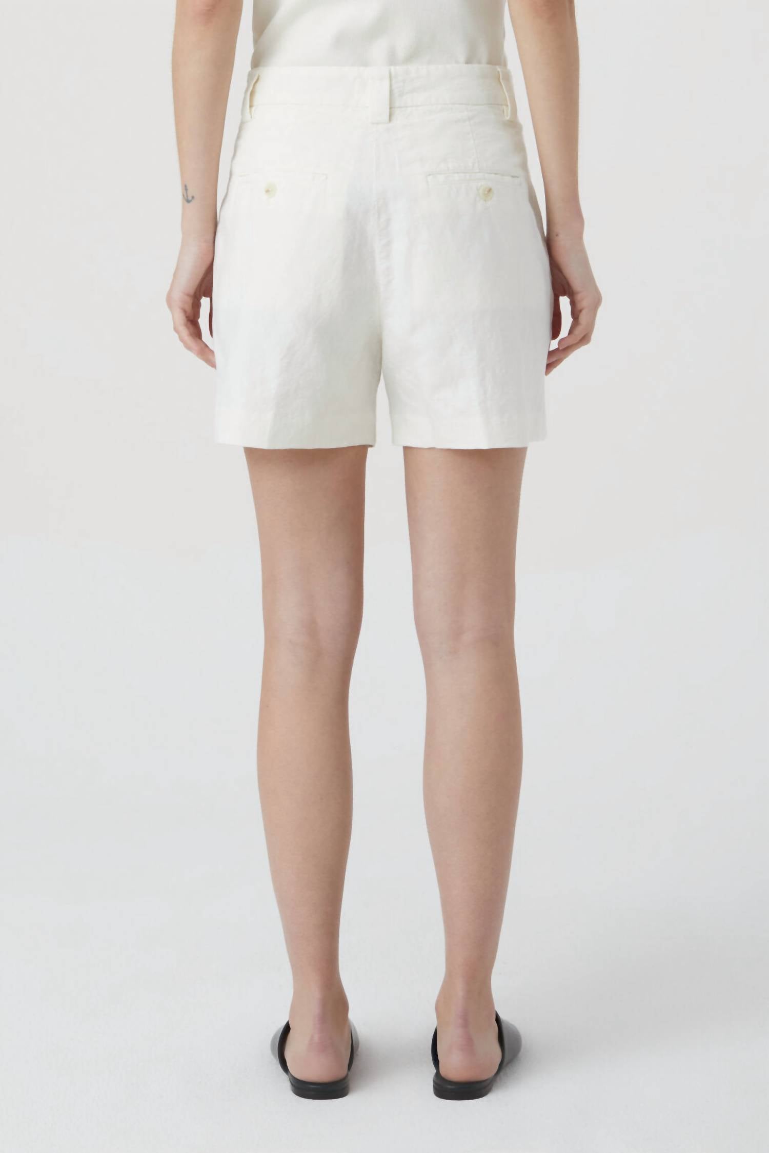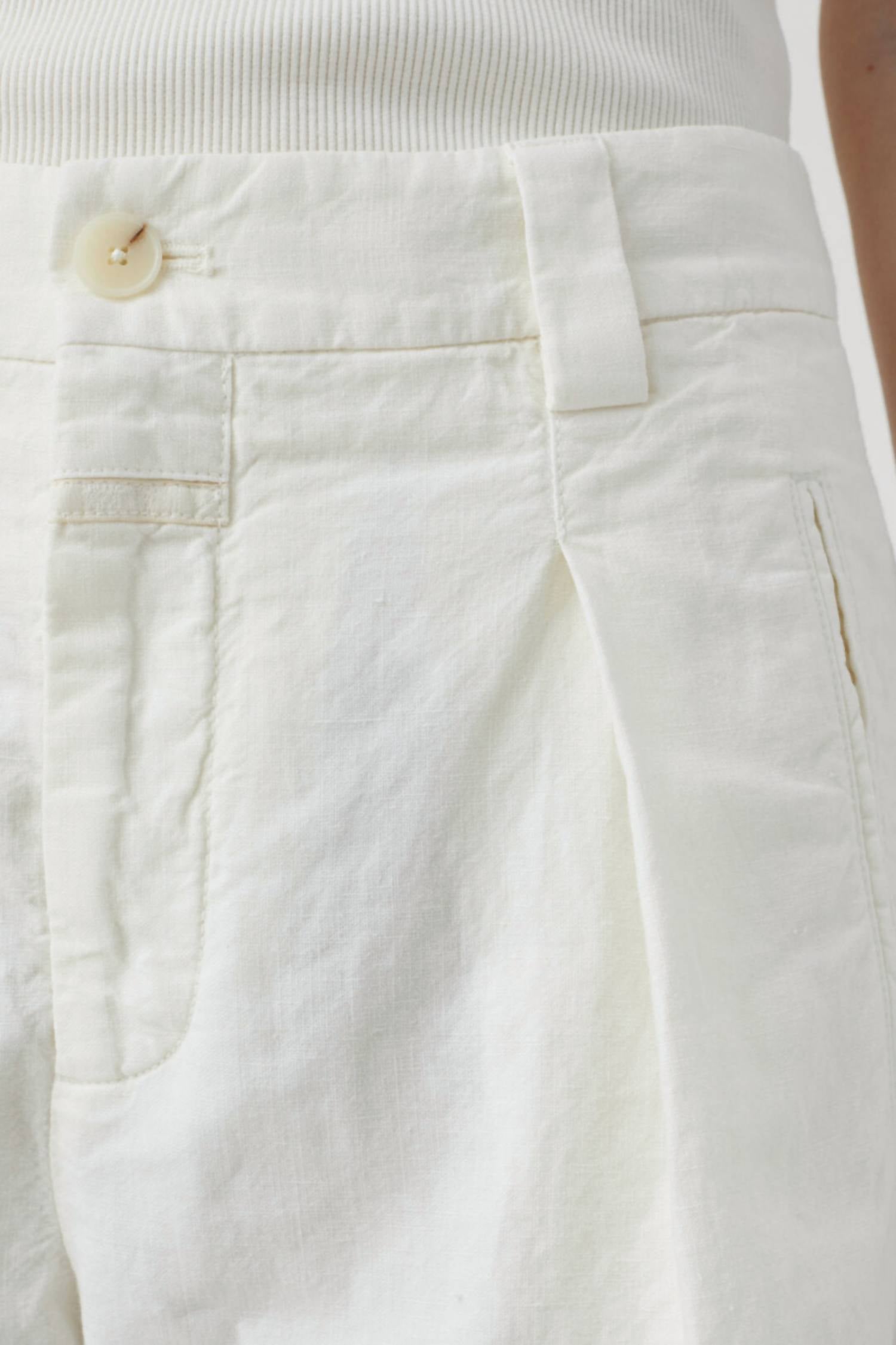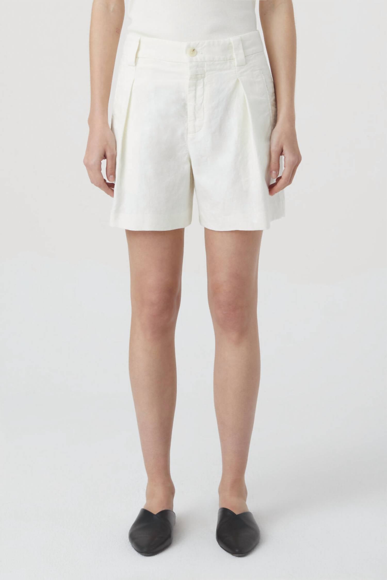 Tuck your favorite tee into these high-waist shorts for a more casual-cool feel. Discover the Mid Waist Linen & Cotton Blend Shorts by CLOSED, crafted from a light and vivid linen-cotton mix with a garment-dyed finish. These women’s shorts feature a mid waist, regular fit, and have a flattering inner leg length of approximately 10.5 cm (4.1 inches) in size 27. Made in Romania, they come equipped with piped pockets and buttoned back pockets for added functionality. Care instructions: Machine wash and lay flat to dry.