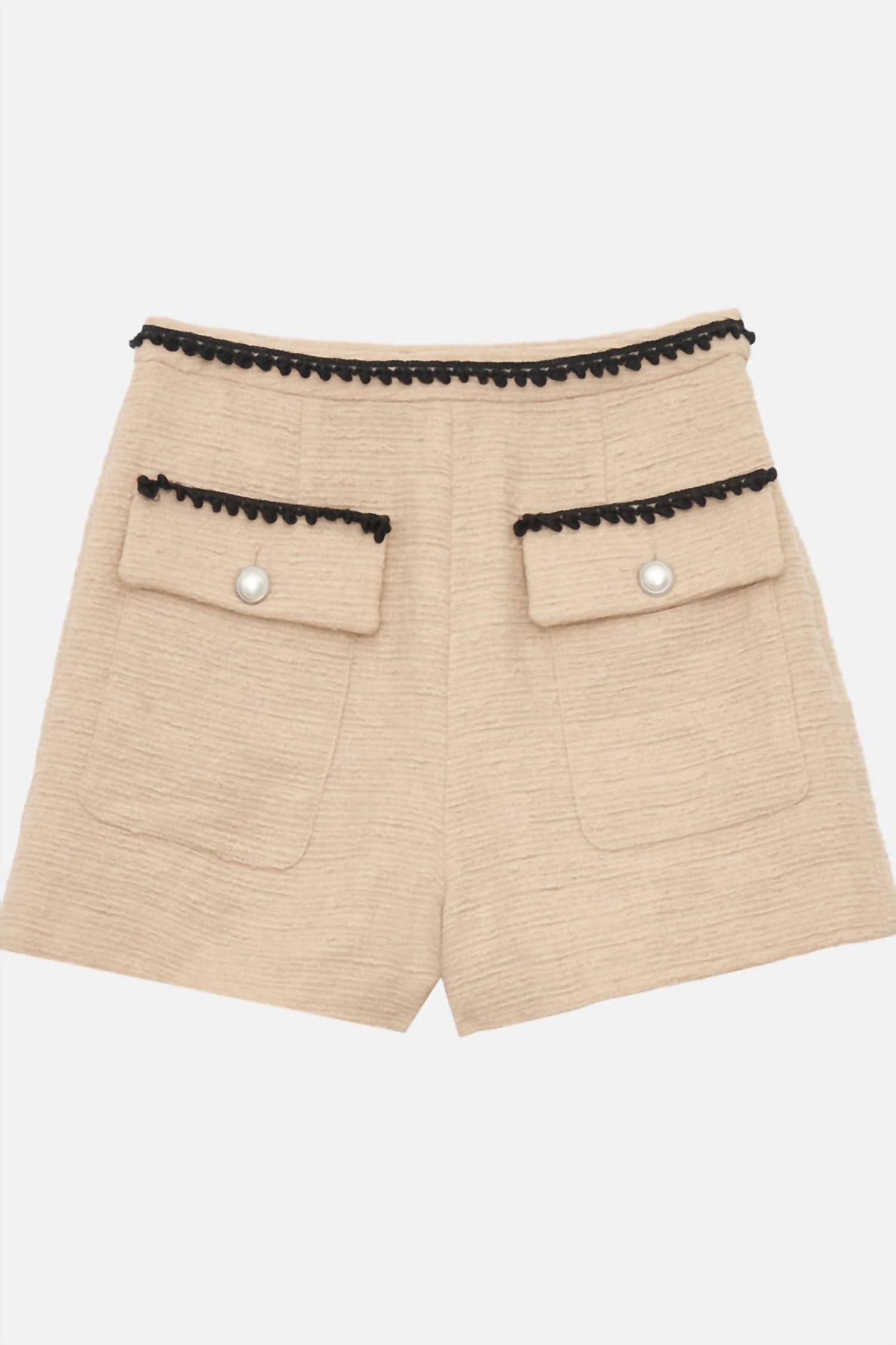 Tuck your favorite tee into these high-waist shorts for a more casual-cool feel. Crafted from a textured cotton blend in a flattering high-waisted design. These natural-toned shorts feature large flap pockets adorned with contrasting black braid and pearl buttons, adding an elegant touch. They offer the practicality of buttoned pockets and a sleek appearance with an invisible side zipper closure.