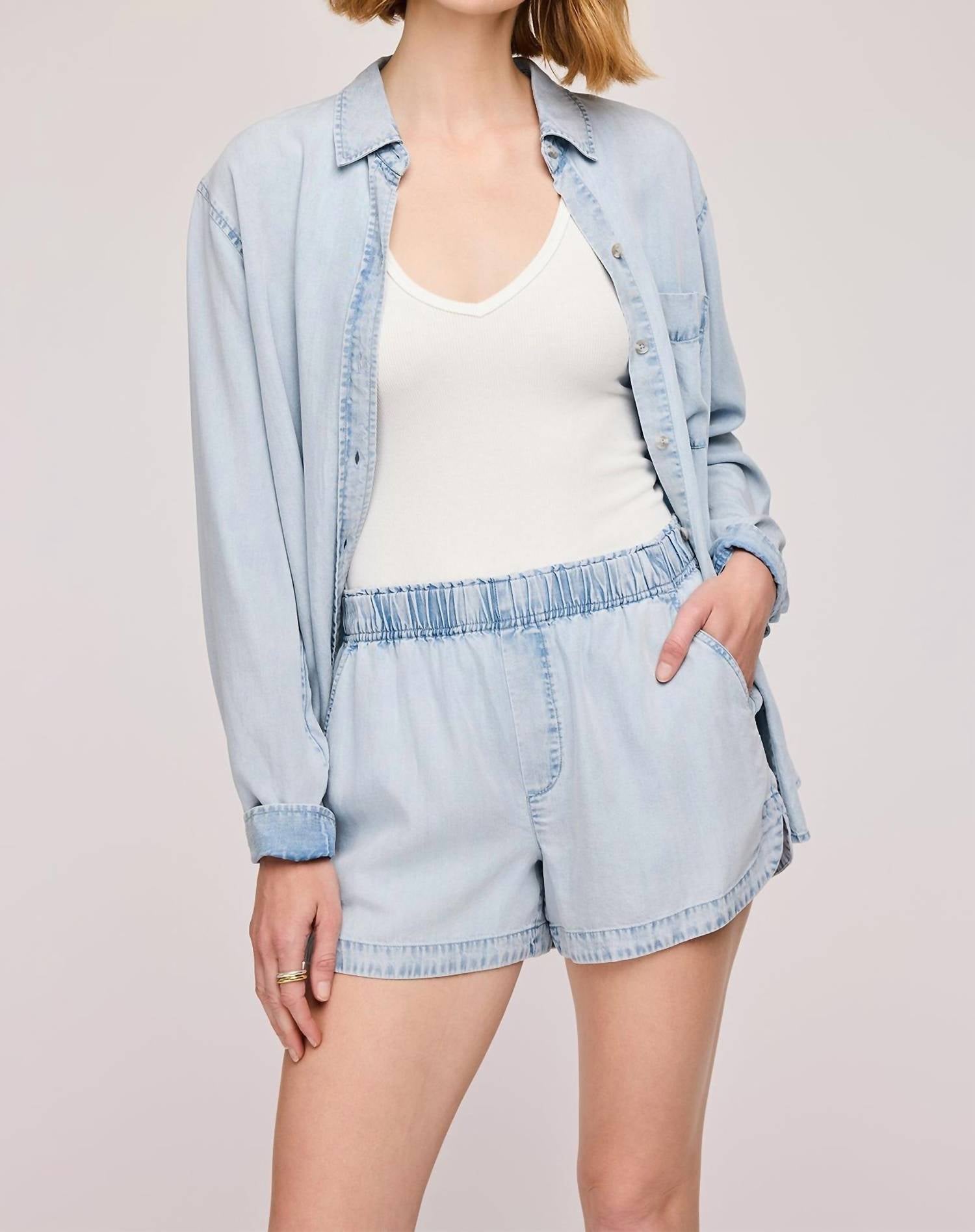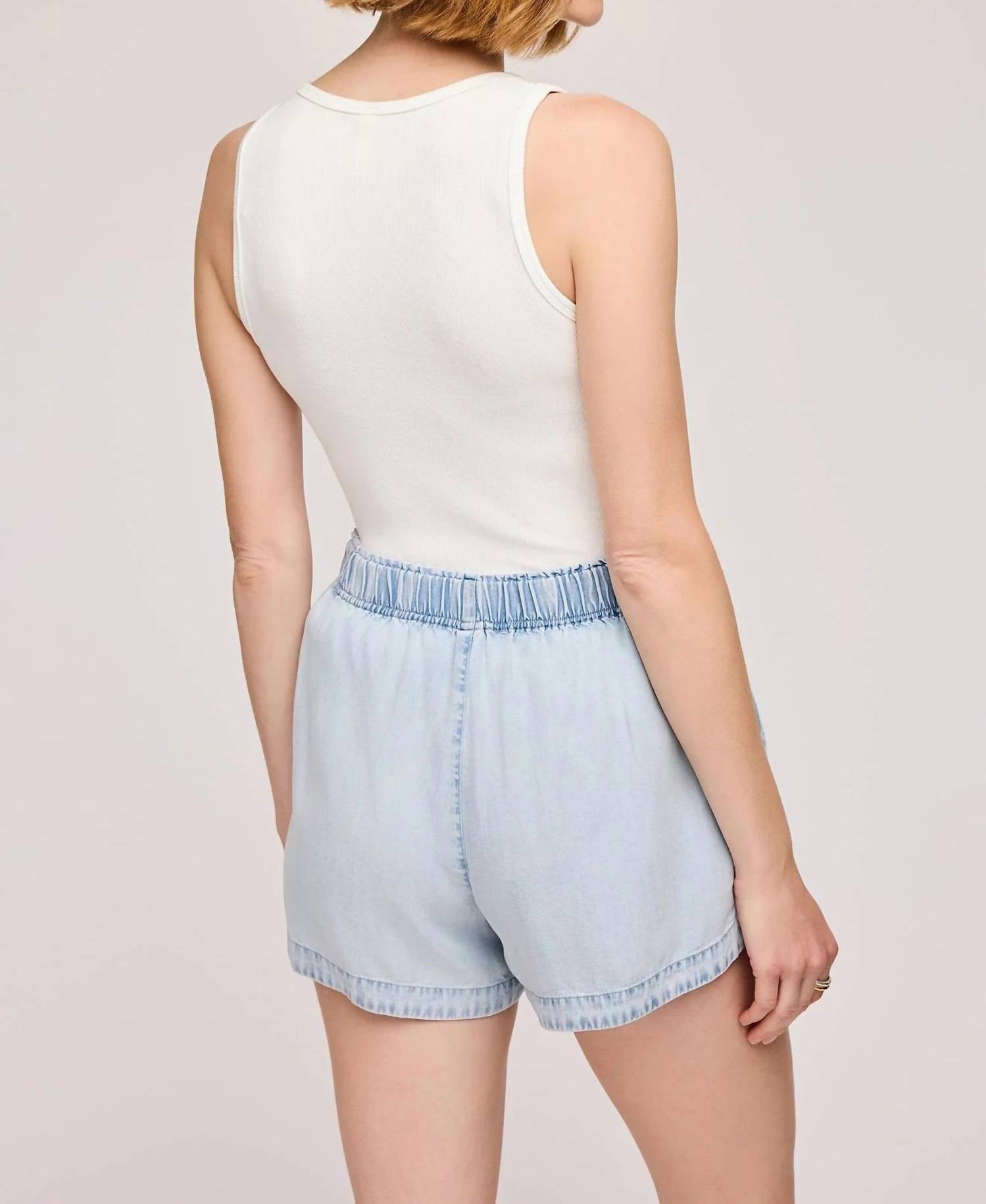 Tuck your favorite tee into these high-waist shorts for a more casual-cool feel. The Wyatt Short by Gentle Fawn is a stylish addition for summer, crafted from soft Lyocell fabric known for its dimensional look. In a light blue hue, this high-waisted design features slash pockets and a faux fly detail for a touch of 90s flair. The pull-on closure and elasticated waistband ensure comfort and ease on any vacation. Care instructions include hand washing and laying flat to dry.