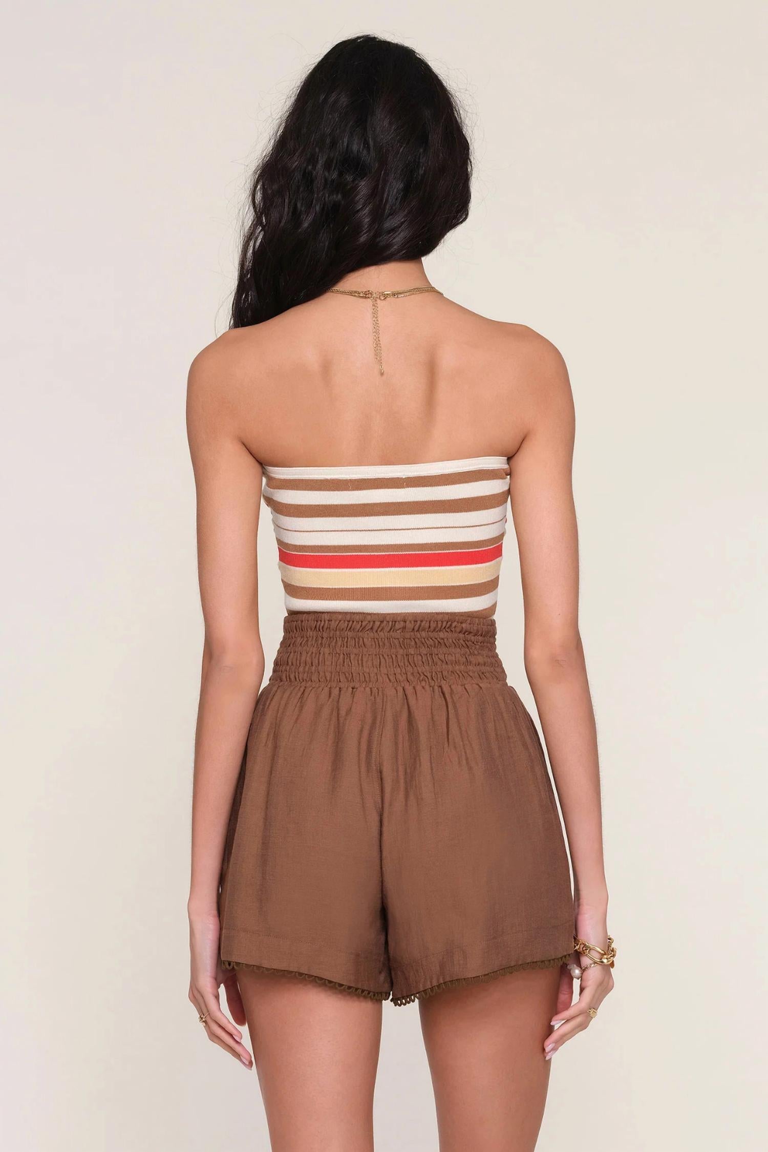 Fit to perfection, we love these high-waist shorts and you will too. Elevate your vacation wardrobe with the Smocked Waist Short by Heartloom, a chic piece designed for effortless style. Crafted from a comfortable blend of 67% Rayon, 18% Linen, and 15% Nylon, these shorts feature a flattering smocked high waist and scalloped trim for added elegance. With side pockets for convenience and a pull-on closure, these fully lined shorts offer both practicality and fashion. In brown with a 4" inseam, they are perfect for the minimalist trend this spring. Care: Hand wash and line dry.
