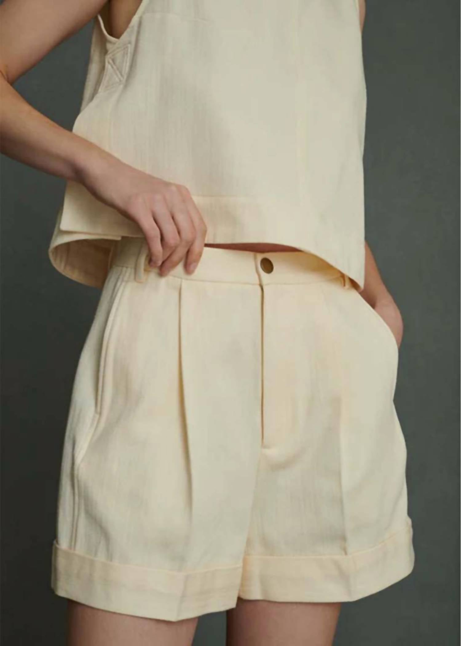 High-waist is here to stay and we especially love this style short. Presenting the Iggy High-waisted Cotton Canvas Short by Soeur, a chic summer essential in a timeless creme shade. These women's shorts feature elegant pleating, high-waist design, and are crafted entirely from 100% cotton canvas. Thoughtfully designed with concealed side seam pockets, two welt back pockets, and a button closure, they're perfect for a minimalist vacation vibe. Made in Romania, care for these shorts by hand washing and laying flat to dry.