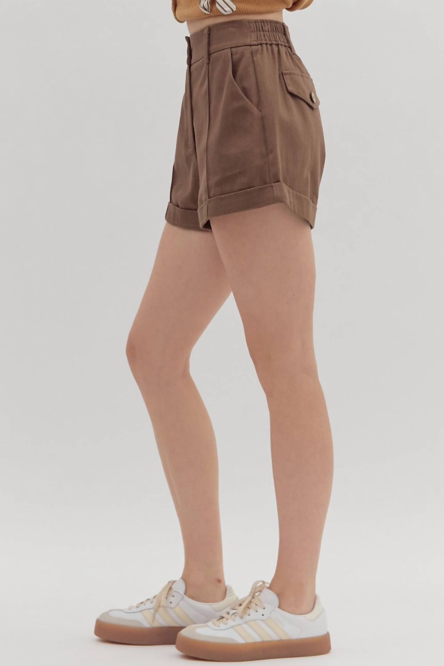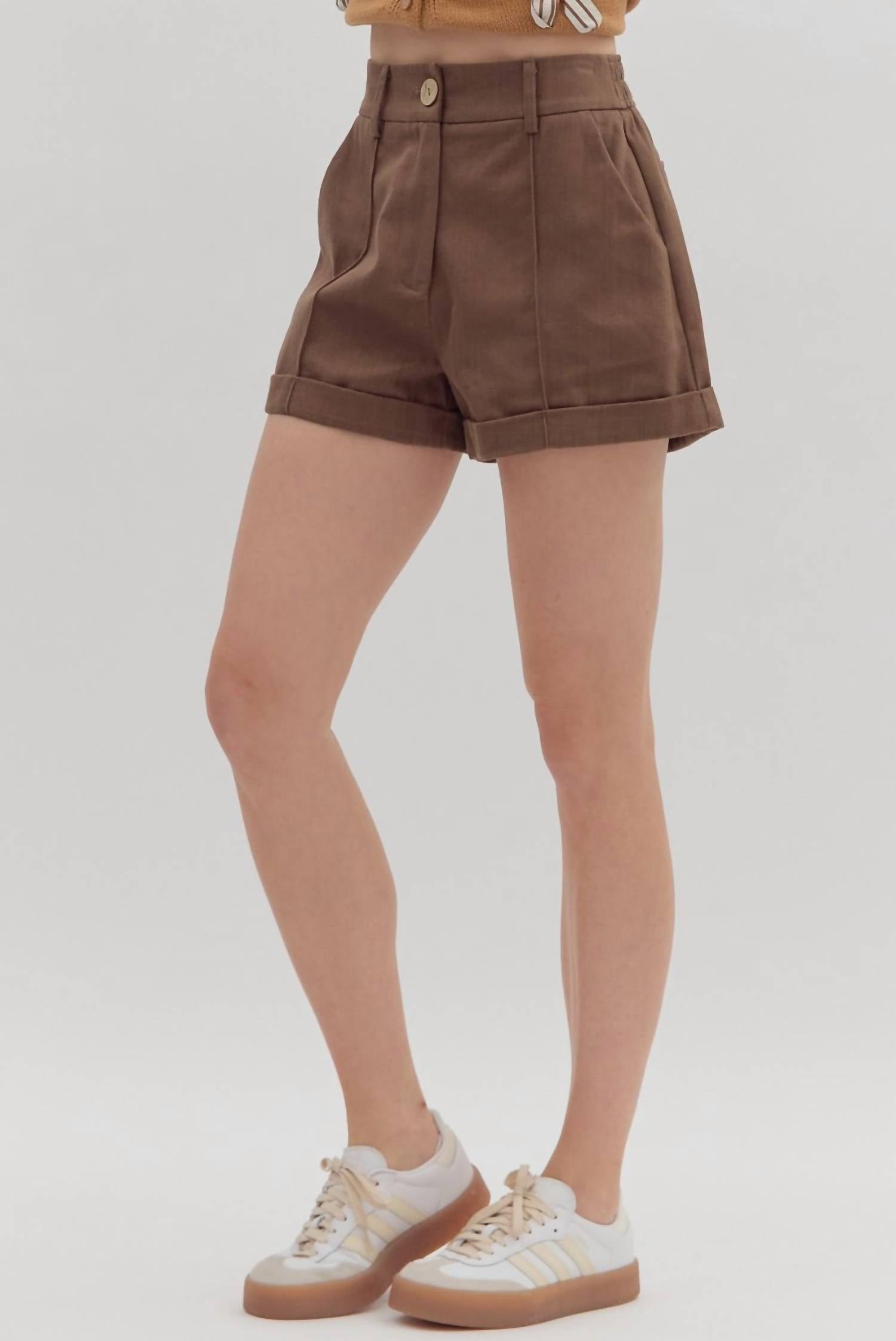 High-waist is here to stay and we especially love this style short. Enhance your seasonal style with the Sutton High-Waisted Shorts by entro in a vibrant terracotta hue. These women's shorts feature a solid pattern with a tailored silhouette and cuffed hems, crafted from breathable woven fabric for airy comfort. Designed with functional side pockets and belt loops, they offer practicality along with a flattering high-waisted fit and button closure. Available waist measurements are small 26", medium 28", and large 30", making them a minimalist staple for both casual and dinner party occasions.