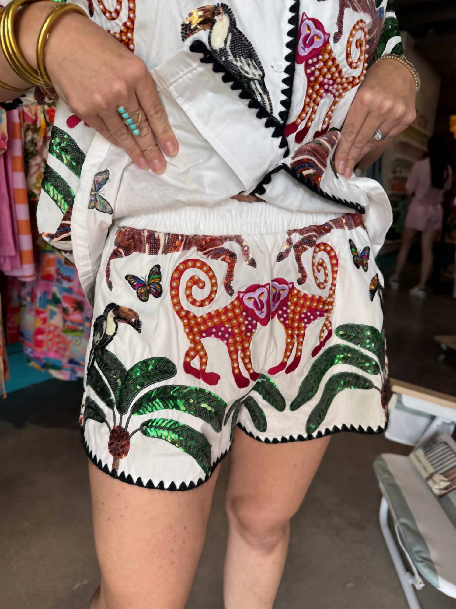 High-waist is here to stay and we especially love this style short. Elevate your vacation wardrobe with the Trim Safari Short by Queen of Sparkles, featuring a striking graphic pattern in white and black. Designed for women seeking a fierce look, these high-waist shorts shine with sequins and jewels, making a bold statement. The pull-on closure ensures effortless style. Crafted for spring adventures, these shorts are your perfect vacation companion.