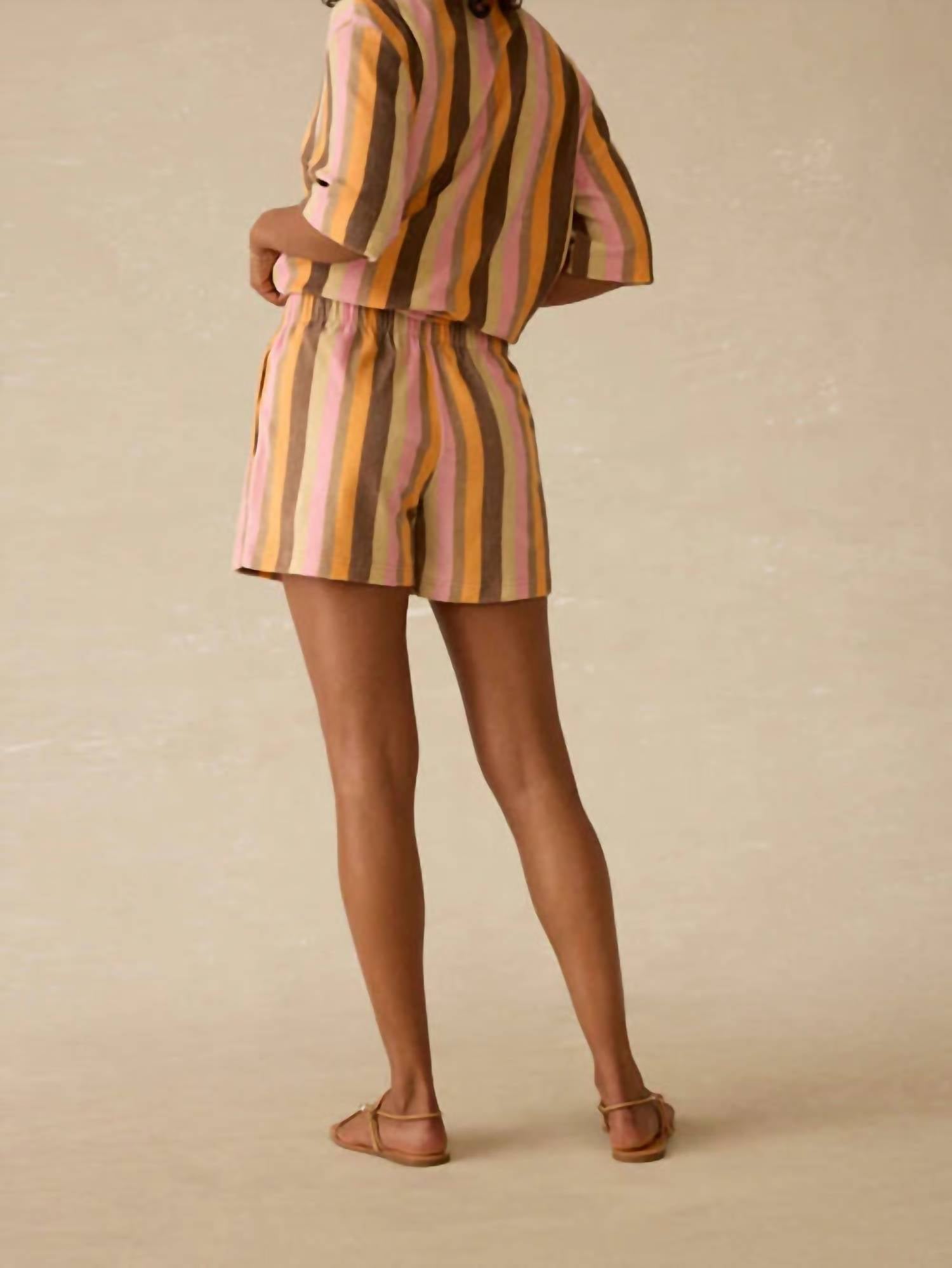 High-waist is here to stay and we especially love this style short. Introducing the Faherty Cabana Towel Terry Short in a vibrant Sun Kissed Stripe, perfect for relaxed days by the pool or beachside hangouts. These high-waist shorts feature an inseam of 4.25" with on-seam pockets and an encased elastic waistband for a relaxed fit, offering both comfort and style. Made from 100% Organic Cotton, pull on these shorts effortlessly for a laid-back look. Turn inside out, machine wash cold with like colors on a gentle cycle, and tumble dry low.