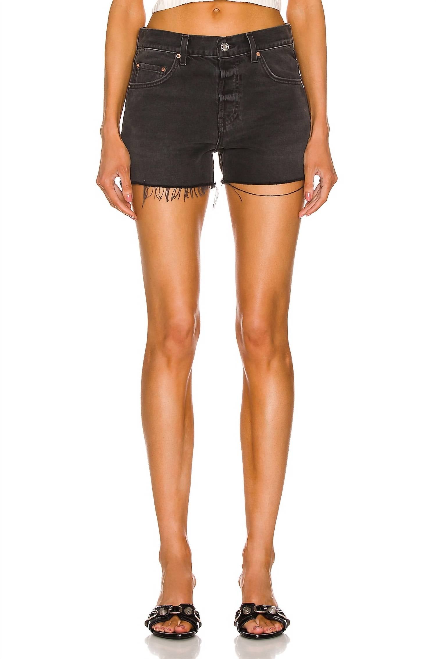 Tuck your favorite tee into these high-waist shorts for a more casual-cool feel. Featuring a chic Solstice Canyon color. Crafted for a comfortable high waist fit. With a composition of 75% organic cotton and 25% RCLY. Proudly made in US. Showcase a subtle faded wash design, a distinctive frayed raw-cut hem, and practical 5-pocket styling complete with a button fly closure. Care instructions are simple, machine wash for easy maintenance.