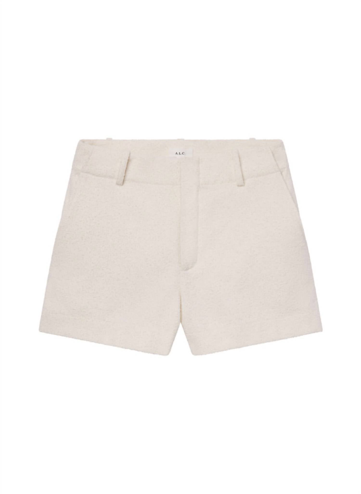High-waist is here to stay and we especially love this style short. Elevate your wardrobe with the Cade Shorts by A.L.C., crafted in a luxurious Italian tweed with a pearl-white hue. These high-waisted shorts are expertly tailored from a 93% Cotton, 3% Polyamide cotton blend, offering a soft terry-like texture that combines comfort with a polished look. Featuring a rise of 12.5", a 3" inseam, and discreet side pockets, this piece is equally versatile with its zip closure and relaxed cuffed hems. Care instructions recommend dry cleaning, ensuring the longevity of this refined textile, perfect for any fashion-forward closet. Model is 5'10" wearing size 4.