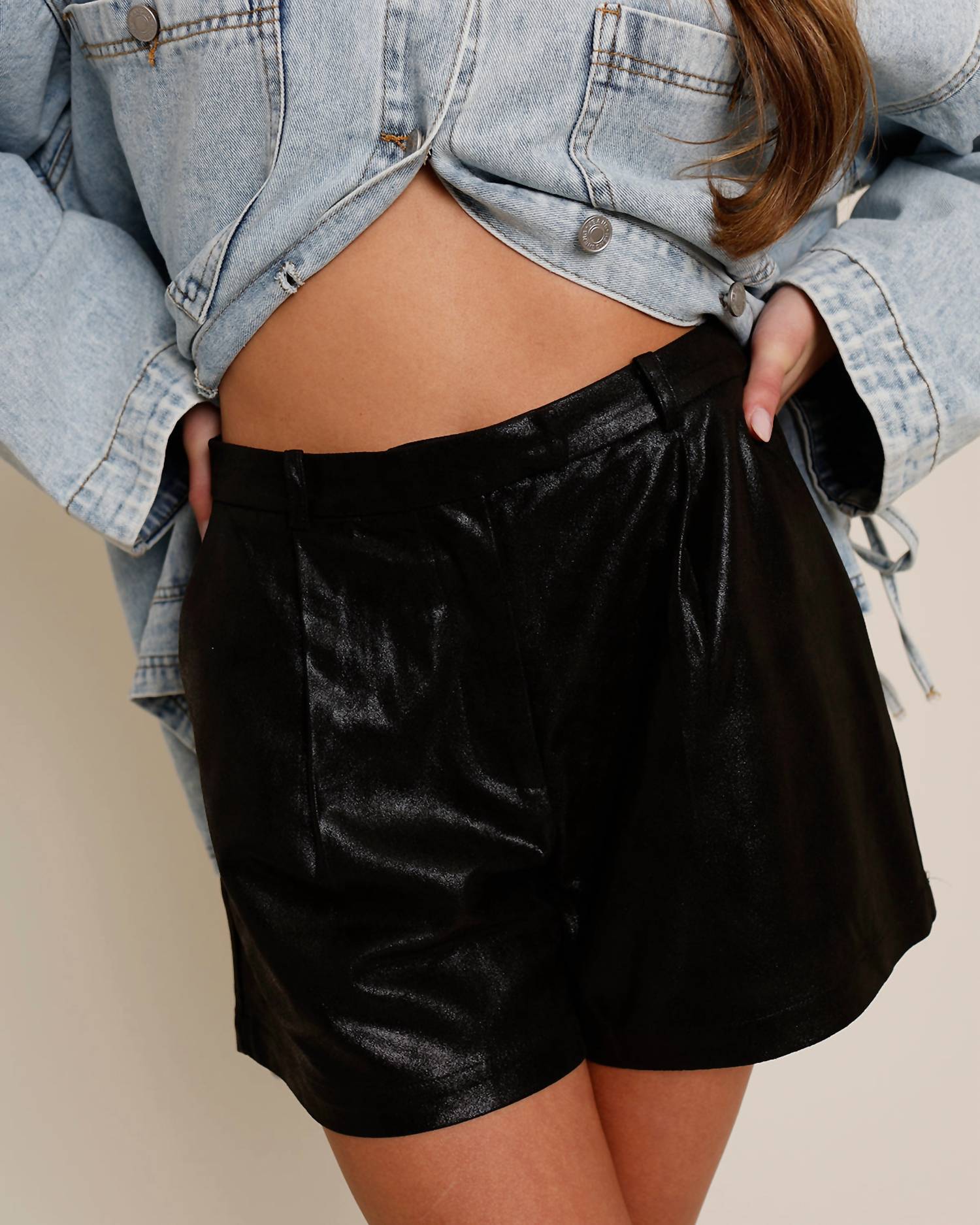 High-waist is here to stay and we especially love this style short. Embrace the party spirit with the Shani Pleated Shorts by FRNCH, crafted from 100% polyester for a metallic sheen that's ideal for special occasions. These black high-waisted shorts feature convenient side pockets, adding functionality to their stylish design. Made for the modern woman, they ensure a flattering fit with a zip closure and are perfect for pairing with tights and knee-high boots in winter. Care for your shorts by hand washing them and laying flat to dry. Model Kayley is 5'7", weighs 118 lbs, and wears a size small (30" chest, 24" waist, 35" hip).
