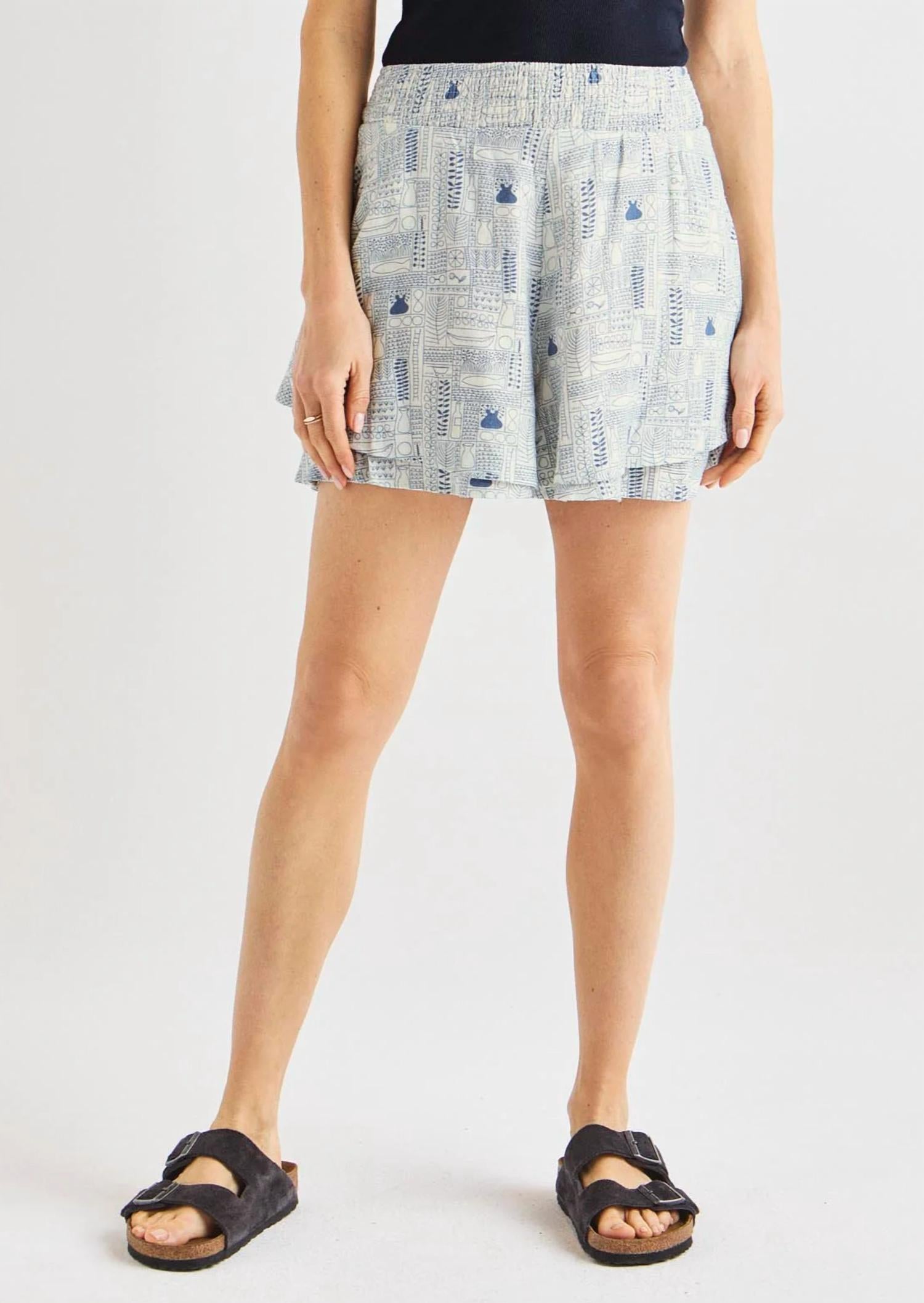 High-waist is here to stay and we especially love this style short. Elevate your summer wardrobe with the Kirby Short by Splendid, featuring the eye-catching Eze Print in white and blue. This high-waist skort combines the ease of pull-on closure with the functionality of side pockets, all in breathable Rayon. Its graphic pattern captures the playful Y2K trend, ideal for vacation activities. Make a stylish statement with these versatile shorts that blend skirt-like elegance with practical comfort.