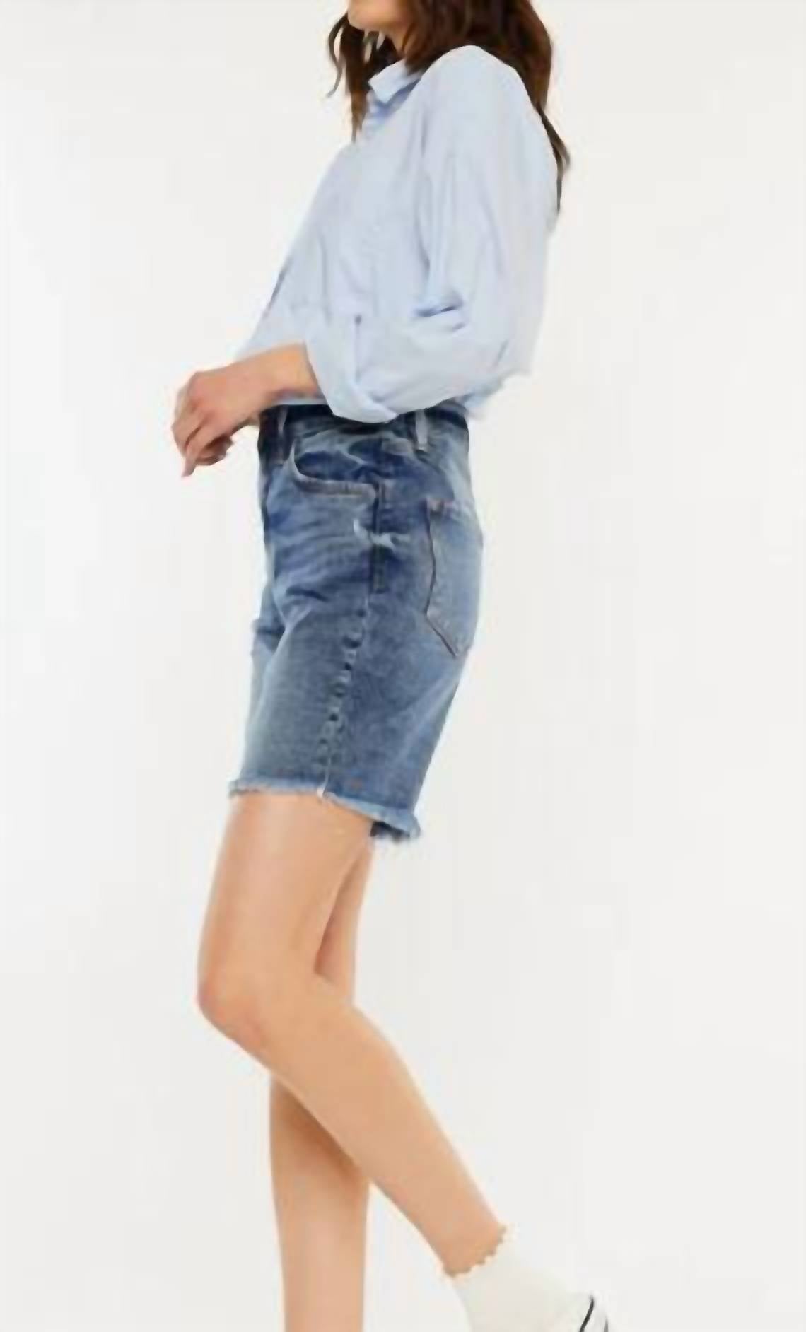 High-waist is here to stay and we especially love this style short. Embrace effortless summer style with the Ultra High Rise Bermuda Shorts by KanCan. Crafted from a comfortable stretch cotton blend, these solid blue shorts feature a high-rise fit and five pockets, perfect for vacation days. The frayed hem adds a trendy touch to this minimalist piece, complete with a button closure. Composition: 99% Cotton, 1% Spandex. Care: Machine wash and tumble dry.