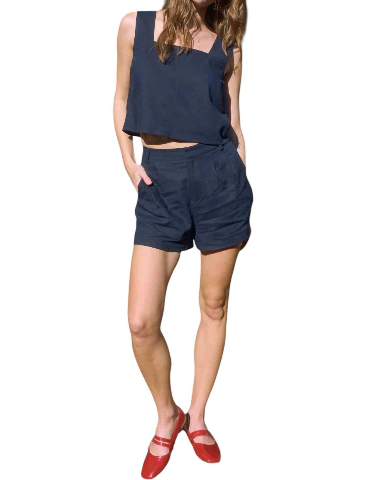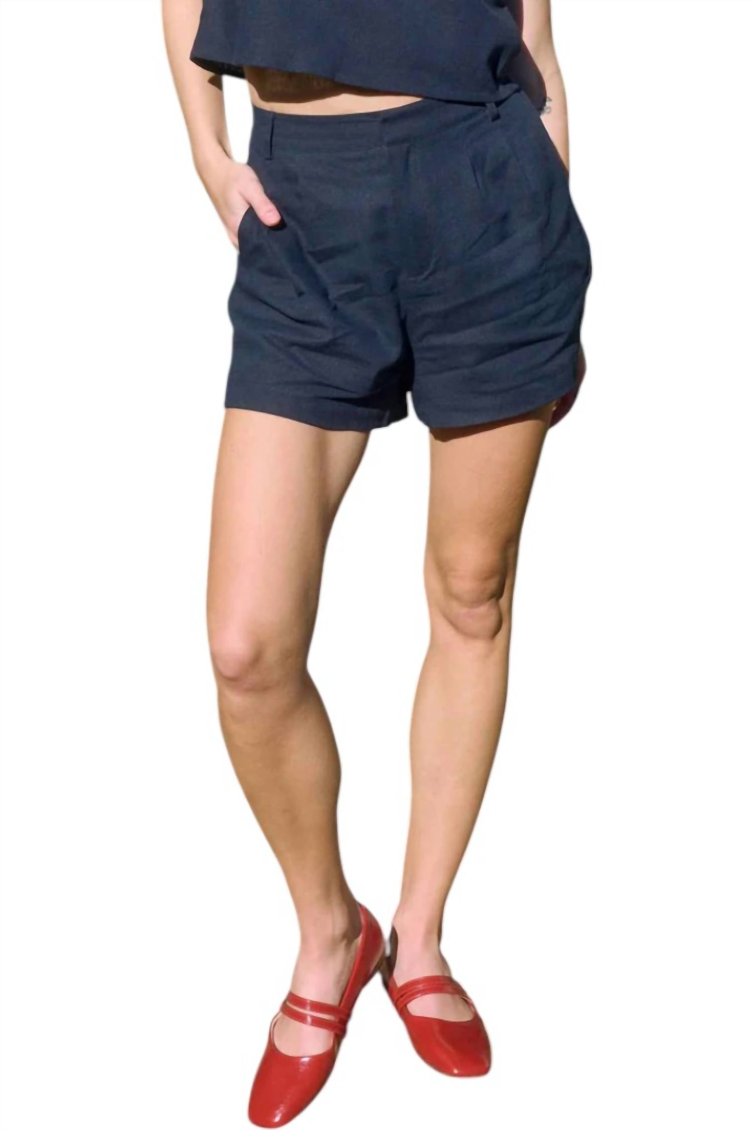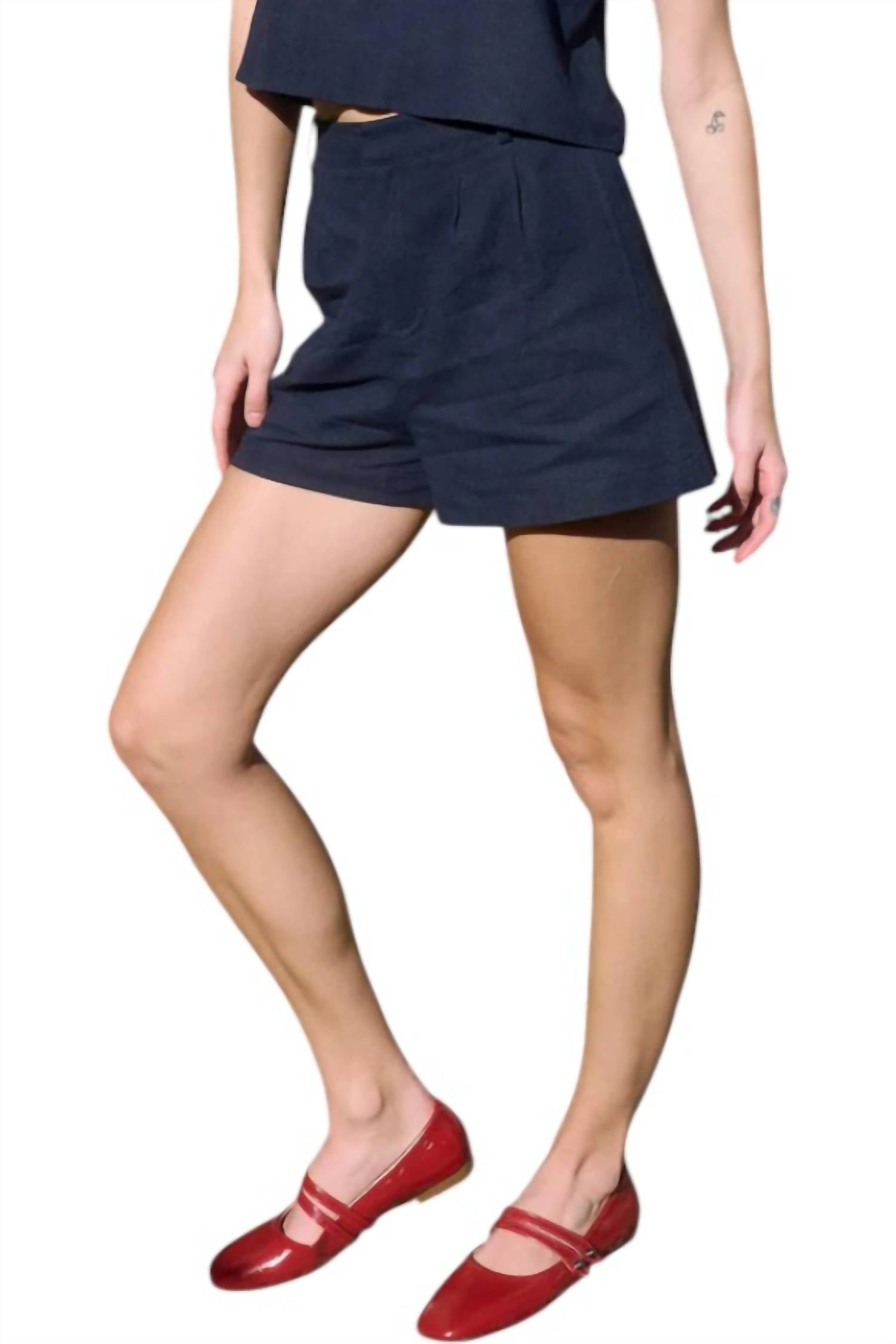 Fit to perfection, we love these high-waist shorts and you will too. Enhance your warm-weather style crafted in a solid navy linen blend that offers breathability and comfort. Feature a high-rise fit with refined front pleats, complemented by a secure hook and eye closure. Elastic waistband and belt loops add versatility, while functional side pockets offer practicality. Lined for a sleek look. Ideal for both polished days and laid-back travel moments. Care instructions include hand washing in cold water and avoiding dry cleaning.