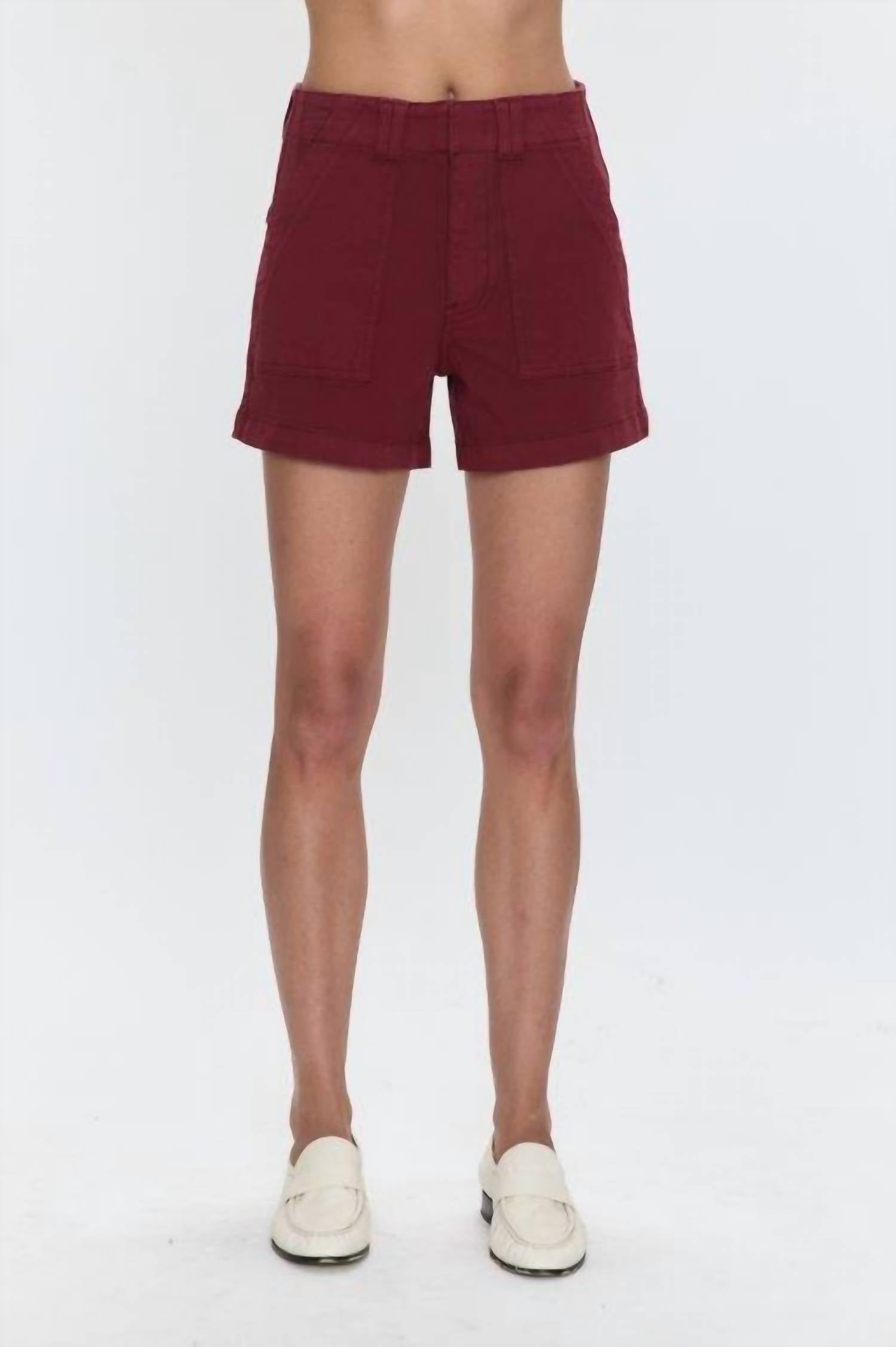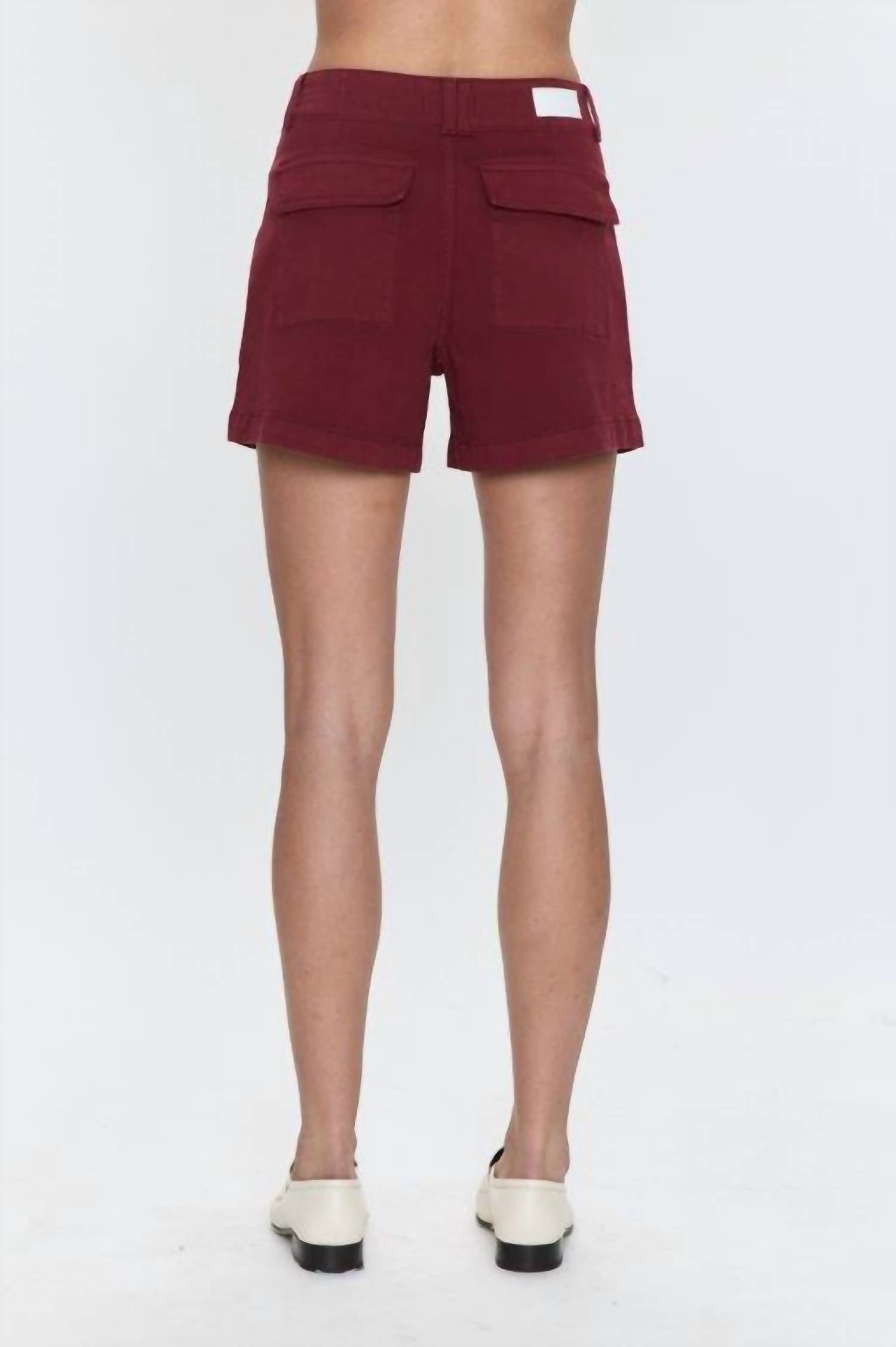 Fit to perfection, we love these high-waist shorts and you will too. Presenting the Marissa High Rise Utility Short by PISTOLA, the perfect choice for minimalist, holiday-ready style in a bold Sangria hue. These women's shorts feature a high-rise and relaxed fit with a medium-length inseam of 4.5 inches, crafted from a comfortable 98% Cotton / 2% Spandex with functional pockets and a zip closure. Wash instruction: Machine wash. Dry instruction: Tumble dry.