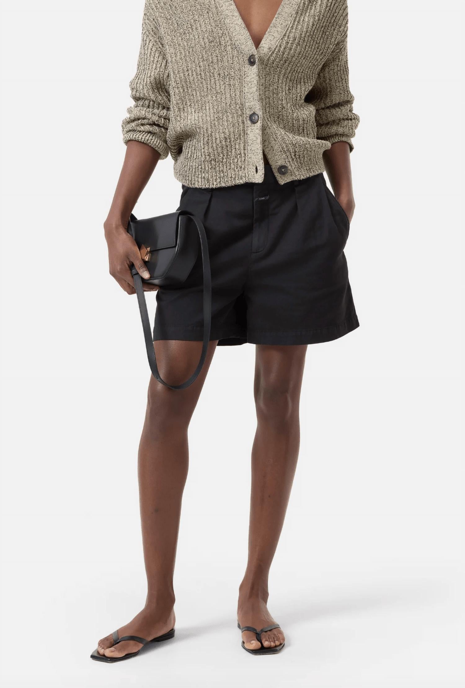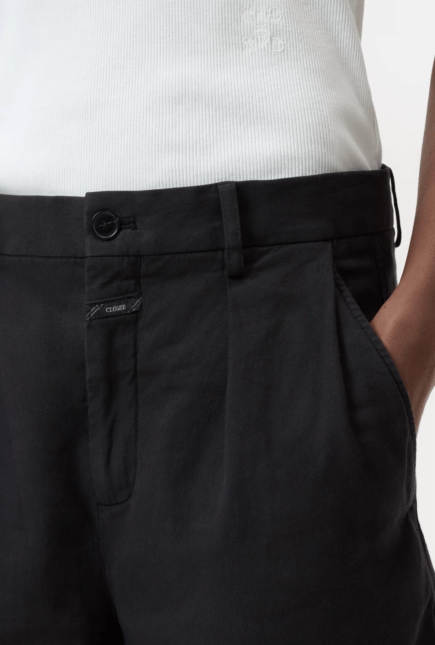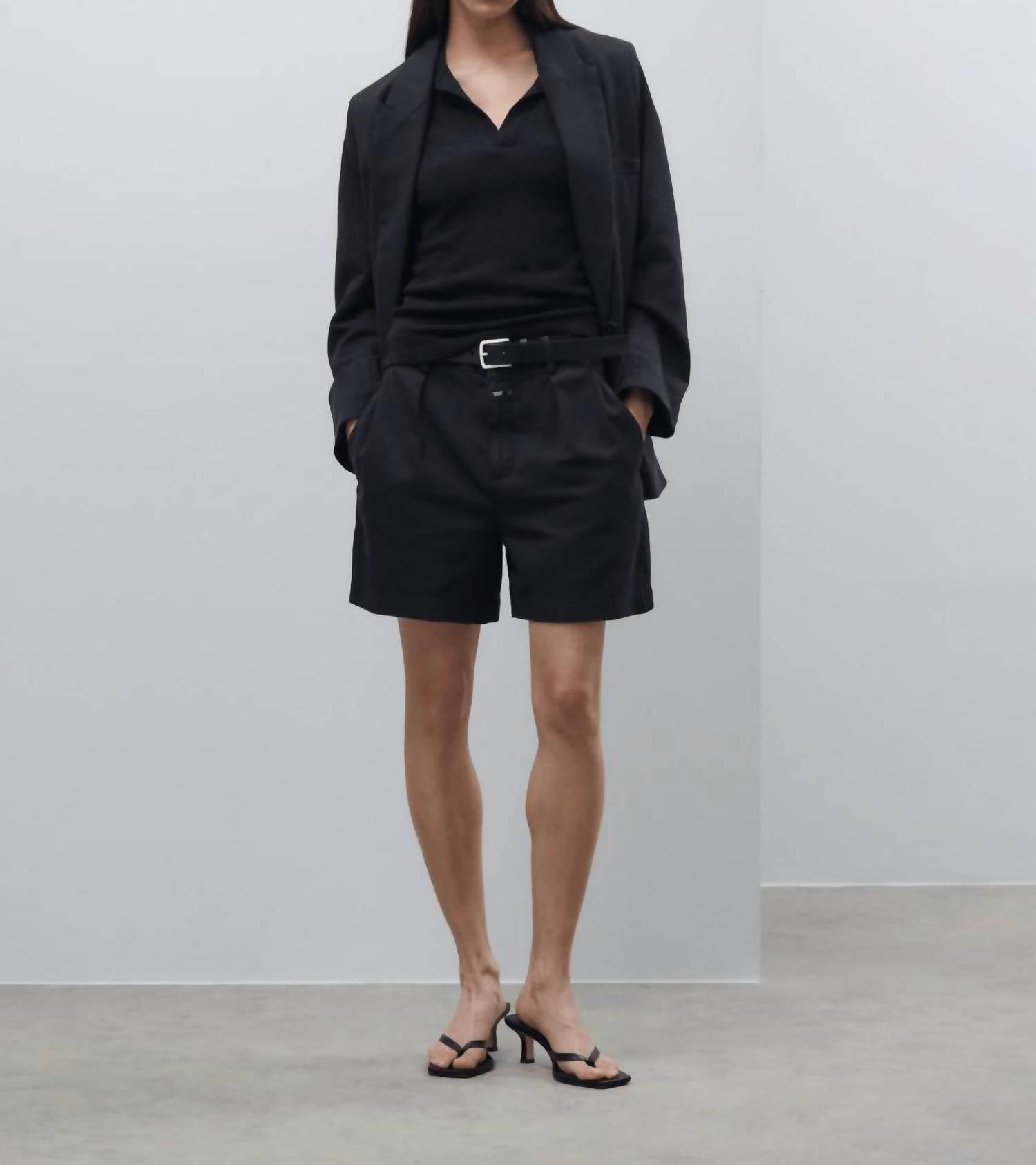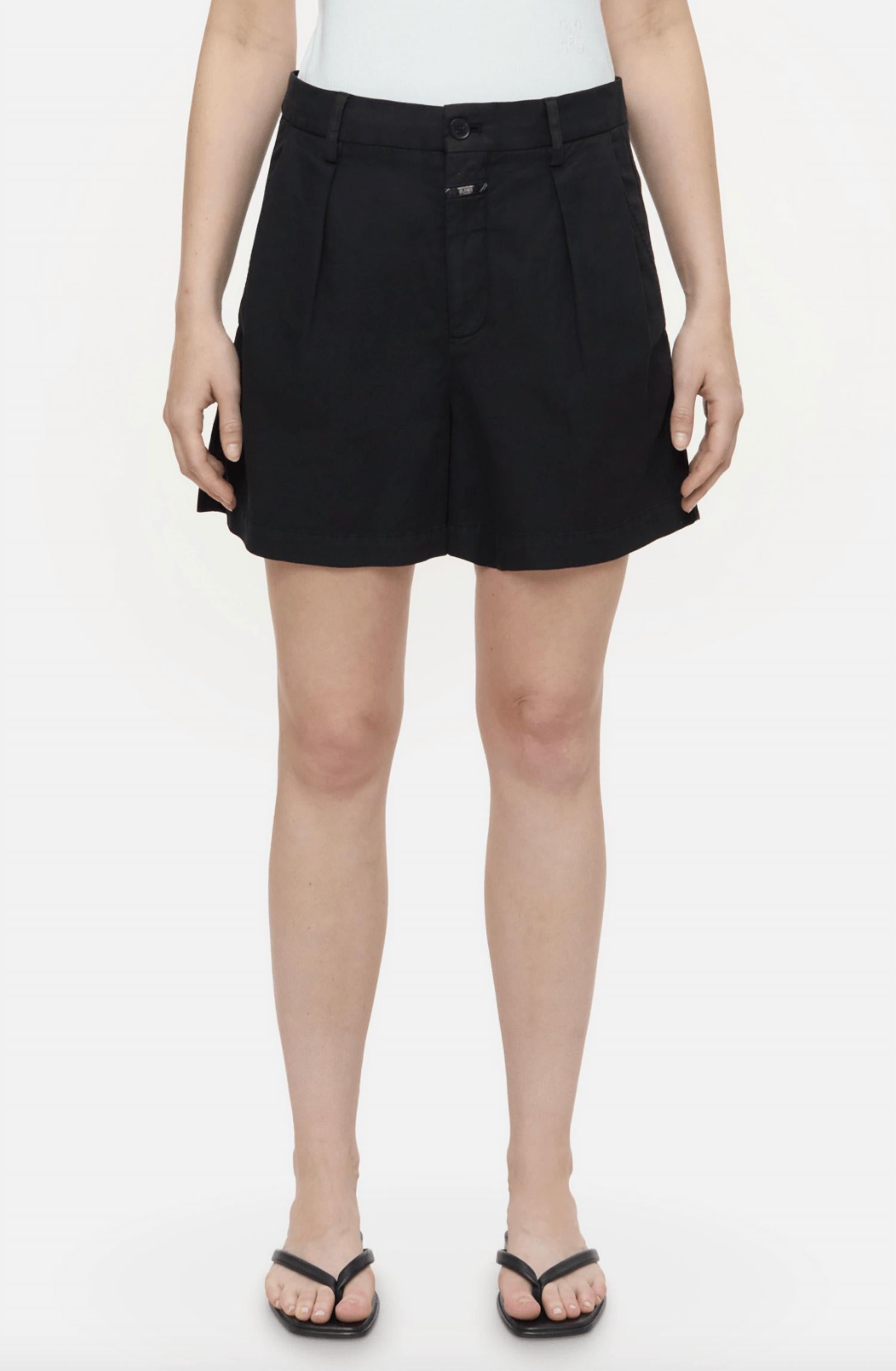 Tuck your favorite tee into these high-waist shorts for a more casual-cool feel. Elevate your wardrobe with the Revyl Shorts by CLOSED, crafted in a luxurious cotton blend with a refined Italian touch. These high-waisted black shorts feature an inseam of approximately 4.7 inches and incorporate a sophisticated horn-look button closure. Designed with practicality in mind, they offer side pockets alongside chic piped back pockets. Expertly made in Romania by Texdata, these shorts ensure style and comfort, perfectly pairing with summer occasions or a dinner party. Composition: 49% Cotton, 31% Linen, 19% Lyocell, 1% Elastane. Care: Machine wash. Model wears size 27; height 1.78 m.