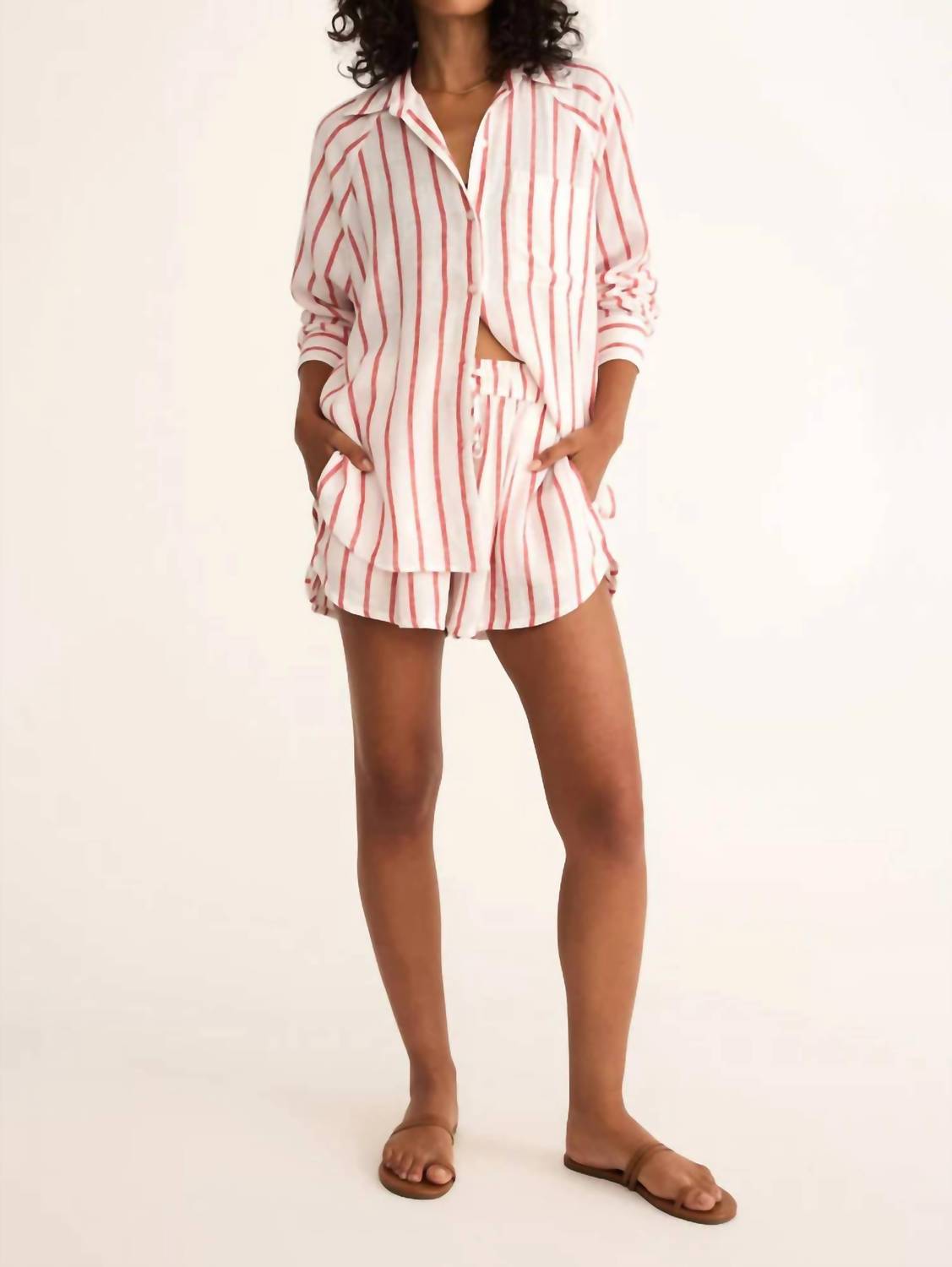 Fit to perfection, we love these high-waist shorts and you will too. Introducing the Perfect Linen Striped Short by Z Supply, an ideal choice for your summer wardrobe. With a high rise and regular fit, these shorts offer a relaxed and casual vibe, featuring a pull-on elastic waistband with a drawcord for customizable comfort. Made from a textured linen blend of 55% Linen and 45% Rayon, they are fully lined and boast side seam pockets for practicality. Enjoy the charm of their red and white yarn-dyed stripe pattern, while keeping care simple with machine wash cold, gentle cycle, and hanging to dry instructions.