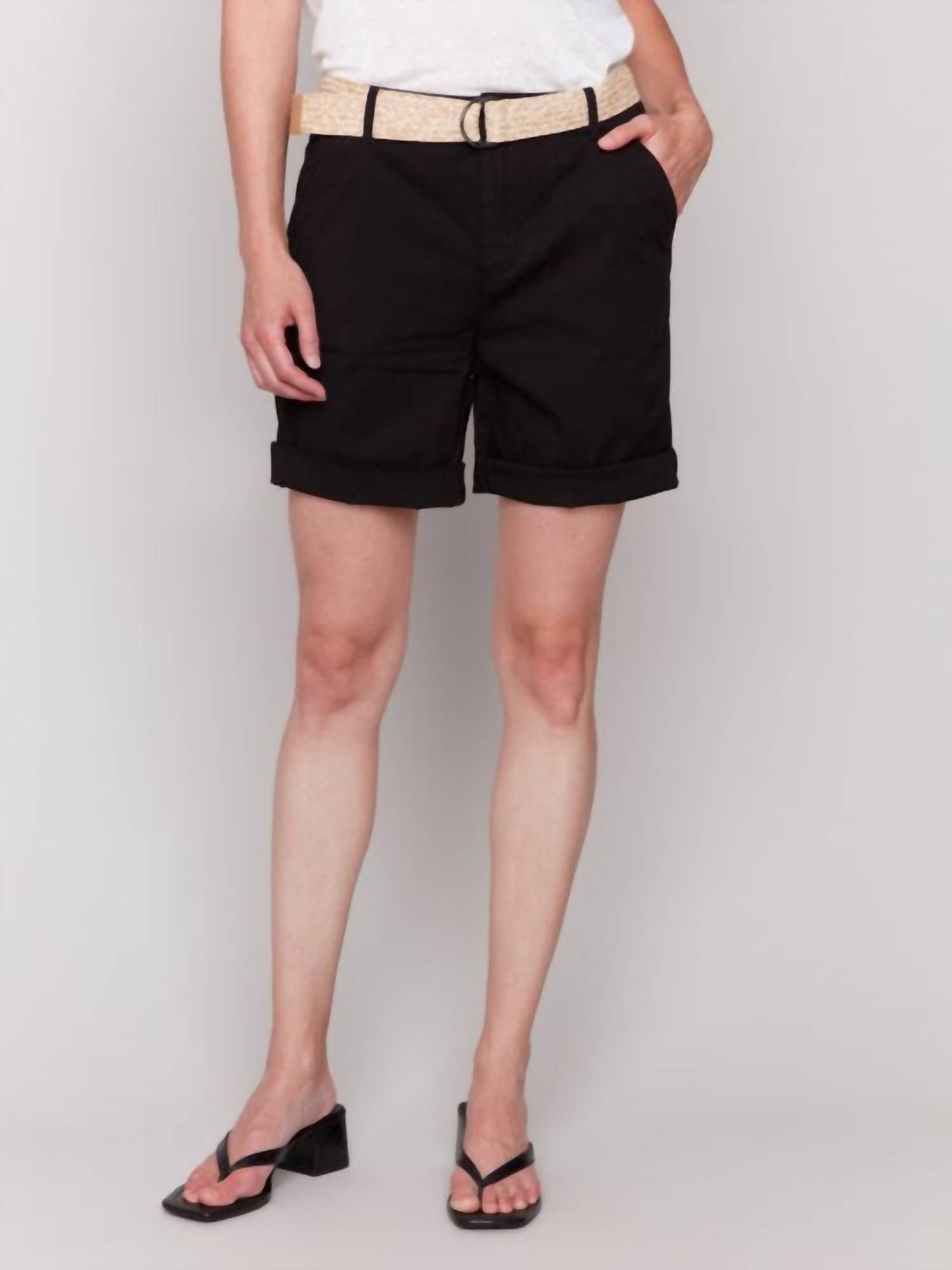 Tuck your favorite tee into these high-waist shorts for a more casual-cool feel. Discover the stylish and comfortable Black Cuffed Shorts With Belt by CHARLIE B, perfect for the summer season. These high-waisted shorts feature a solid pattern with practical pockets and a convenient zip closure, designed for effortless dressing. Made from a blend of 97% cotton and 3% spandex, they offer a comfortable 10" inseam and a flattering 11 1/4" leg opening. Care for them easily by machine washing in cold water and line drying, ironing on medium if needed.