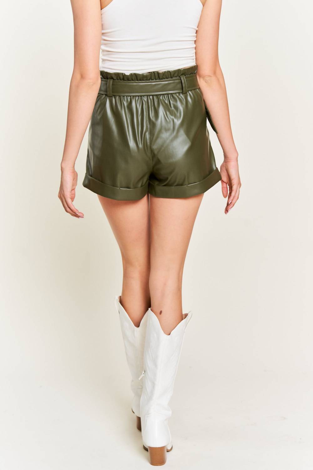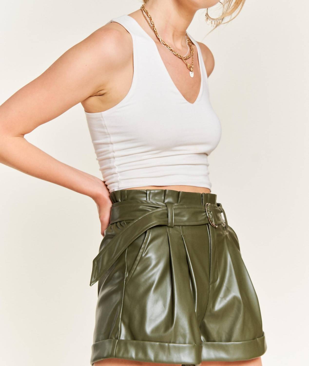 Tuck your favorite tee into these high-waist shorts for a more casual-cool feel. Elevate your wardrobe with the Make It Happen Faux Leather Shorts by JADE BY JANE in a chic olive hue. These shorts are crafted from a blend of 55% Polyester and 45% PU, providing a soft yet sleek finish. Designed with a high-rise waist and featuring a stylish silver D-ring belt, they offer a polished look. The shorts include slanted front pockets and a secure zip closure with an invisible hook and eye, making them both practical and fashionable.