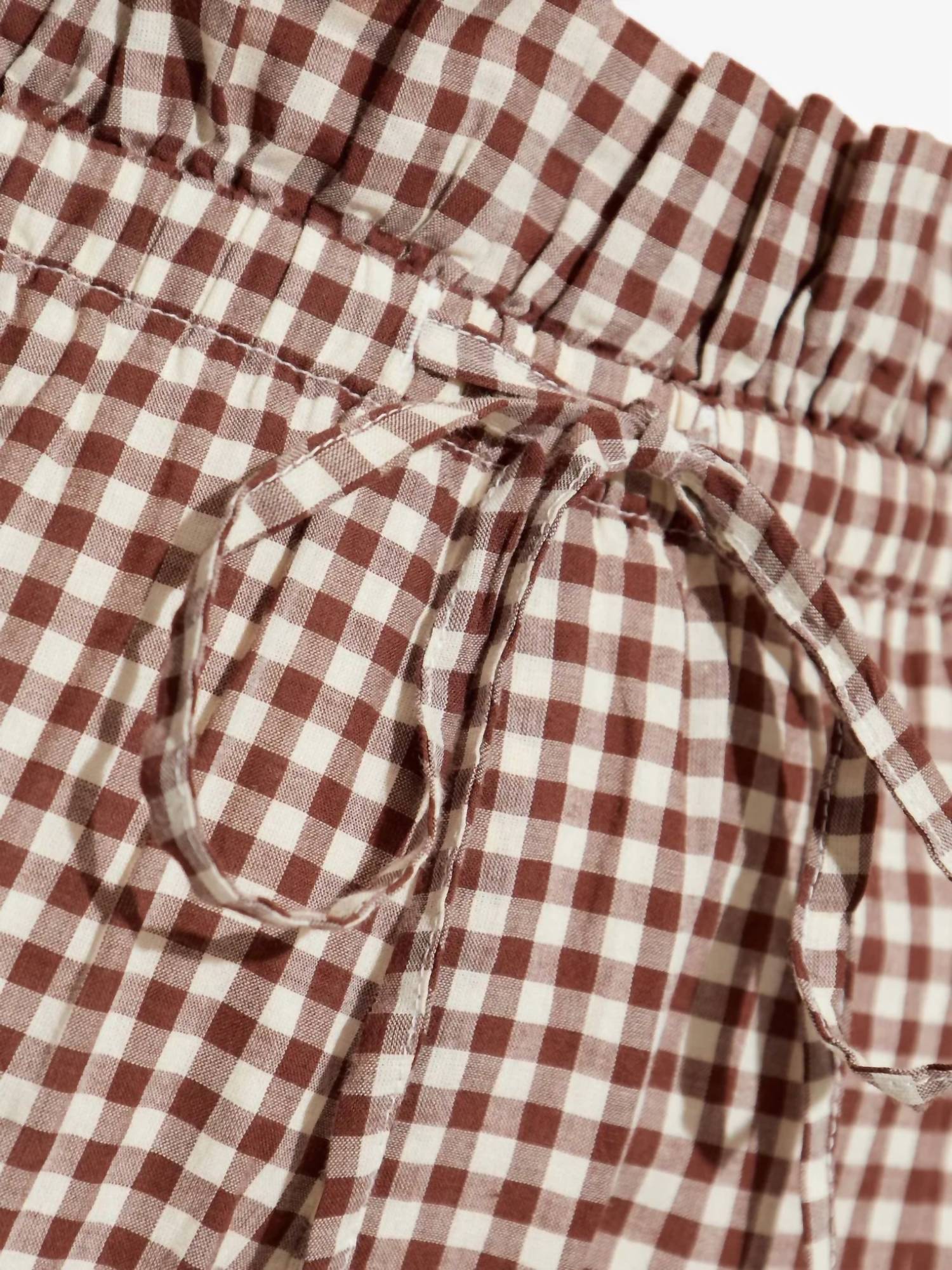 Tuck your favorite tee into these high-waist shorts for a more casual-cool feel. Elevate your spring wardrobe with the Callie High Waist Shorts by POSSE, crafted from hand-loomed cotton in a charming Petite Mocha Gingham pattern. These shorts offer a flattering drawstring high waist and a billowy hem with frill detailing, perfect for a vacation look. Composition: 100% Cotton. Closure: Tie closure. Care: Hand wash, lay flat to dry. Designed without pockets, they are perfect for a minimalist yet stylish statement.