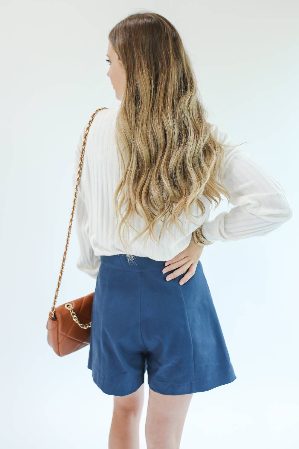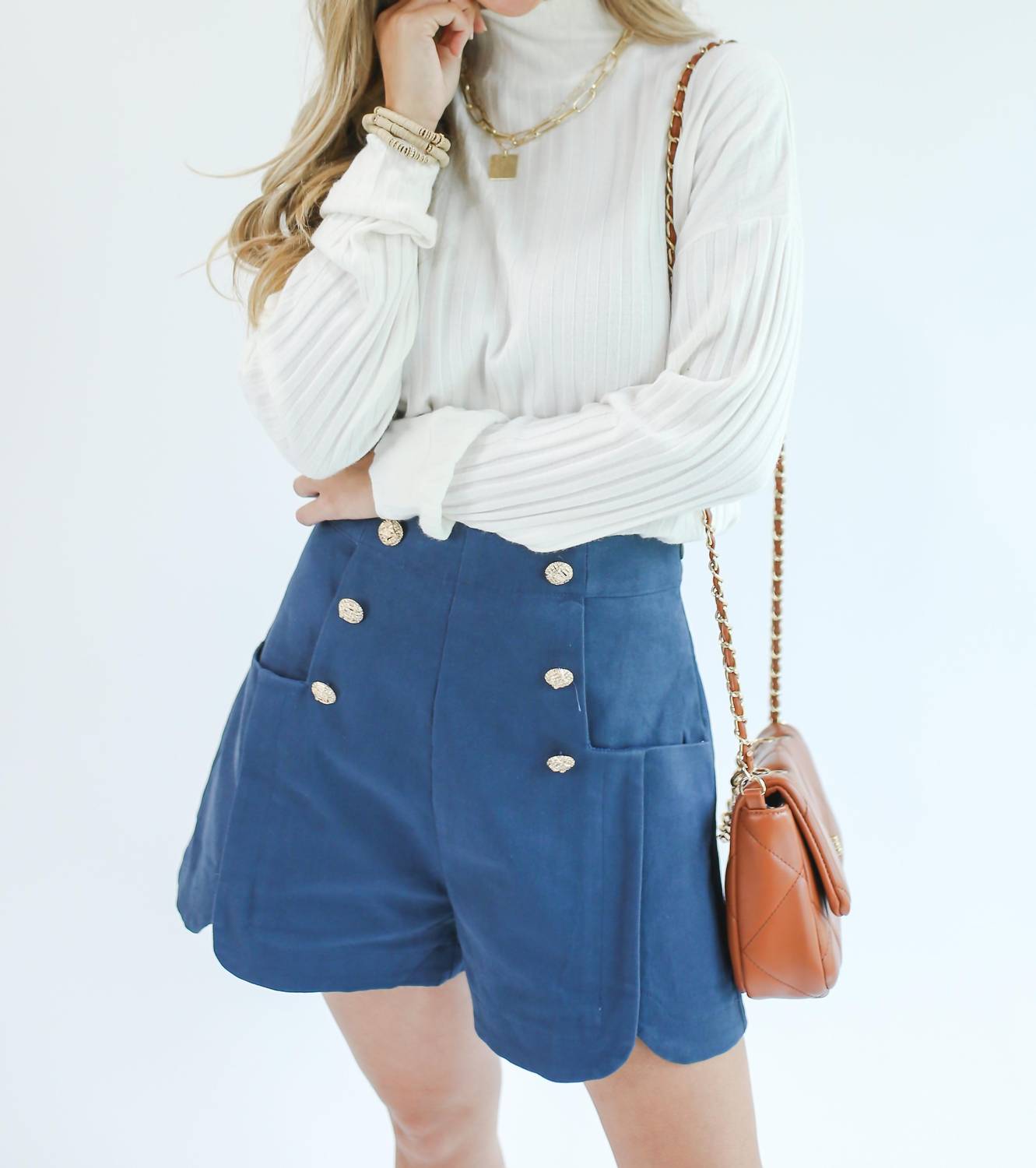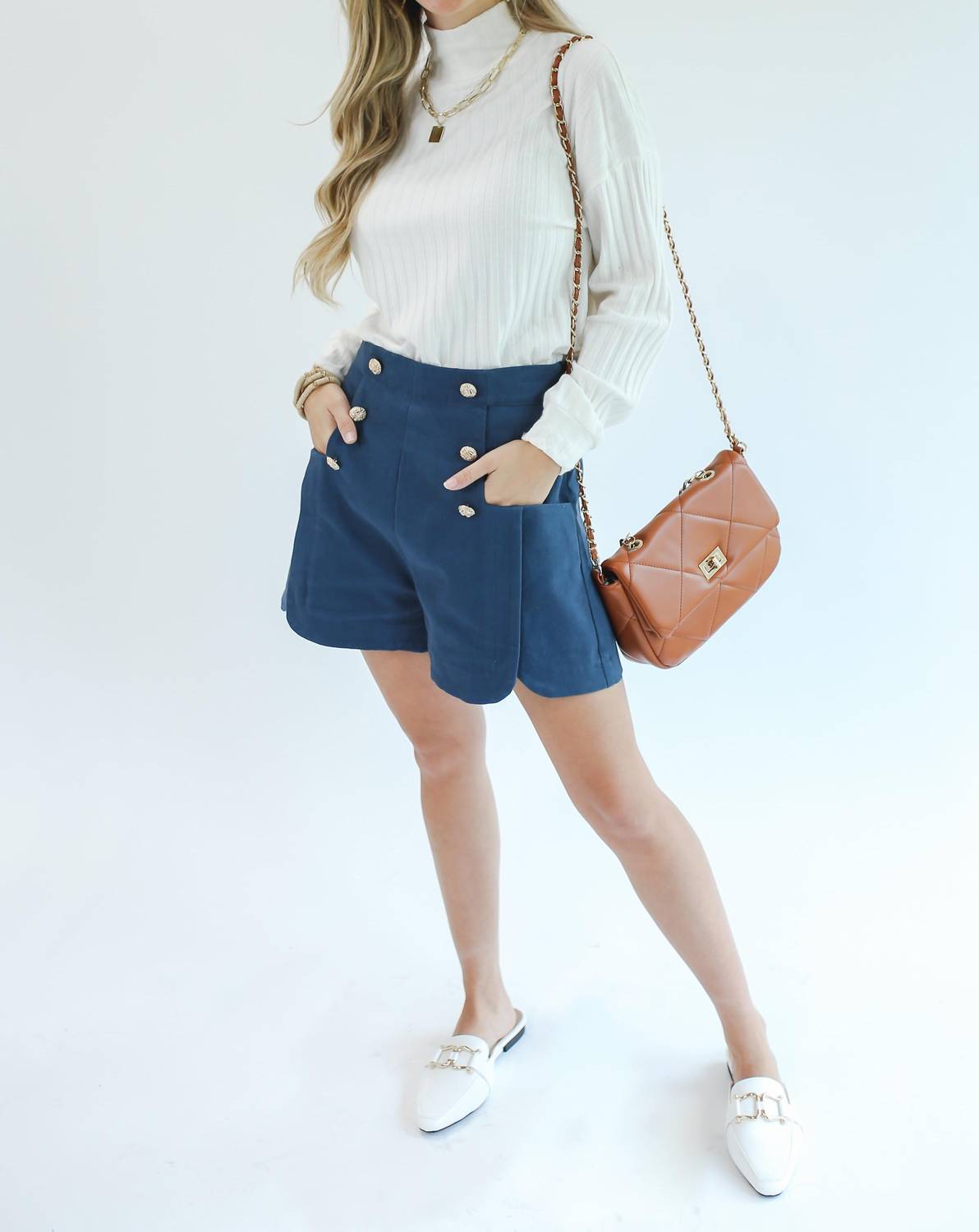This Reagan shorts featuring, a high waistline, a petal pleat hemline with a six-button detail, accent side pockets, and a flattering silhouette that ends in a straight upper-thigh length hemlines. Model is a US size Small. Height: 5'4". Bust: 34". Waist: 25.5". Hips: 34".