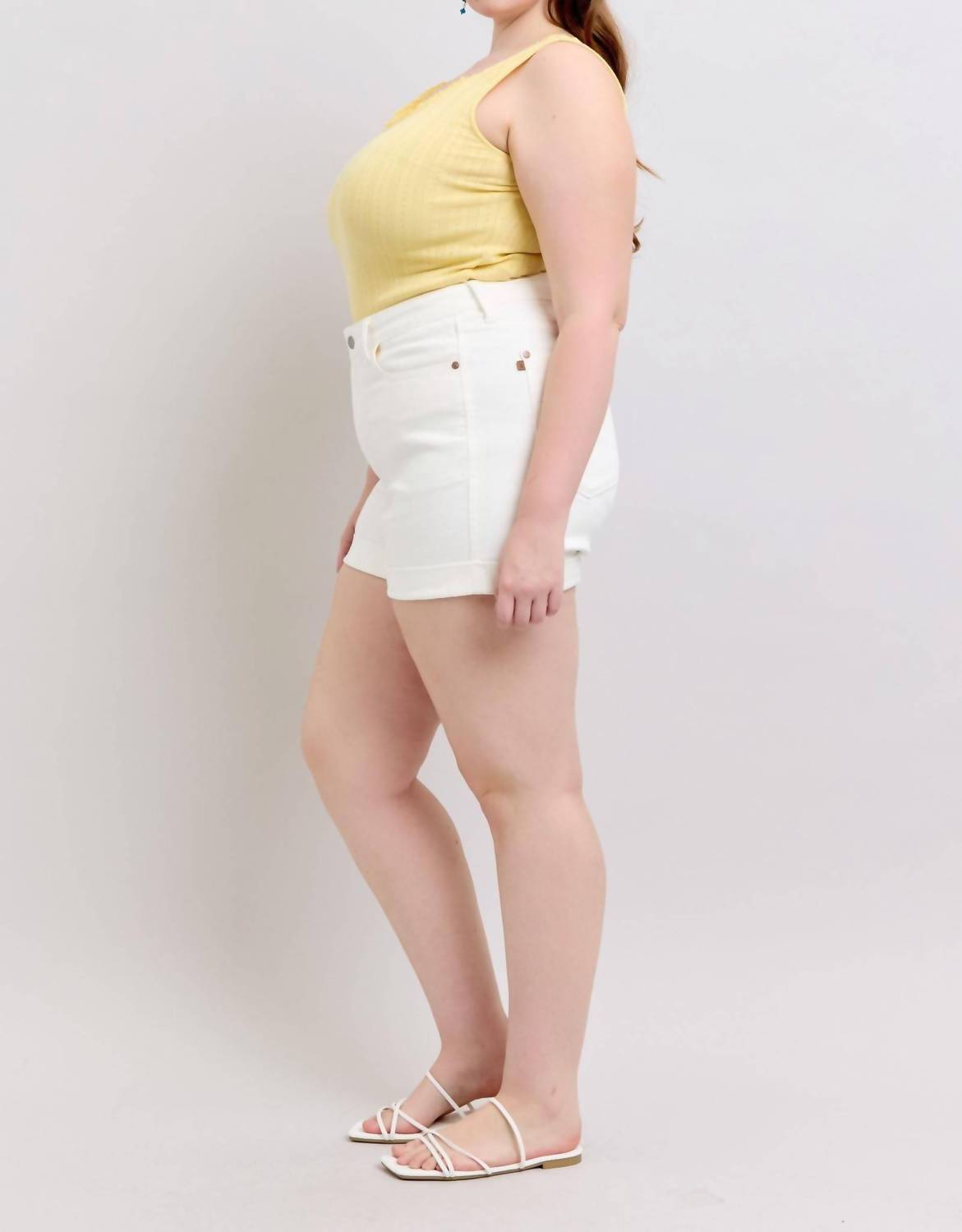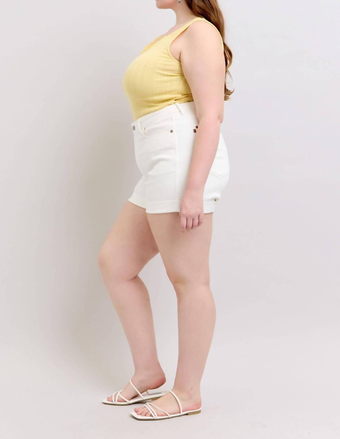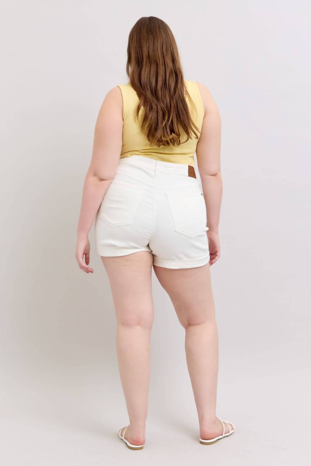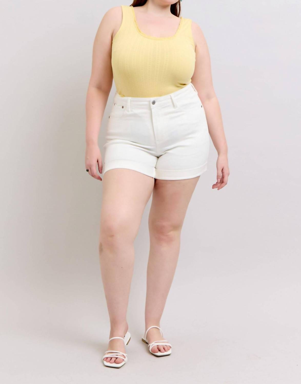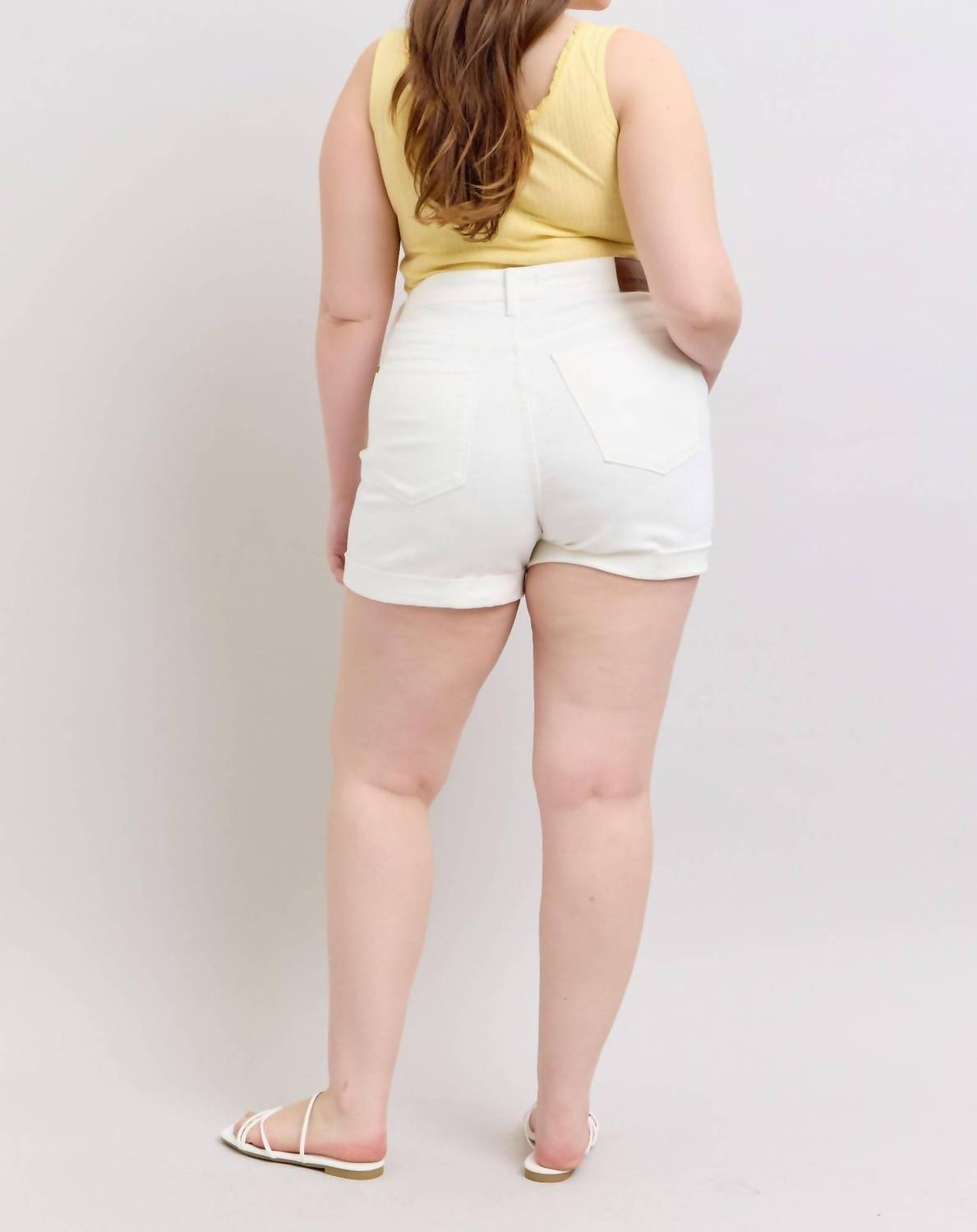Tuck your favorite tee into these high-waist shorts for a more casual-cool feel. Elevate your summer wardrobe with the Judy Blue High Waist Double Roll Cuff Denim Short, perfect for vacation getaways or 4th of July celebrations. Designed for women who embrace the Y2K trend, this solid white short boasts a cotton blend composition of 93% Cotton, 6% Polyester, 1% Spandex, ensuring comfort and flexibility. These shorts feature a button closure and practical pockets, with a high waist fit and inseam variations of 4.25" or 5" depending on size. Care is straightforward: machine wash in cold water, air dry, or tumble on low to maintain quality.