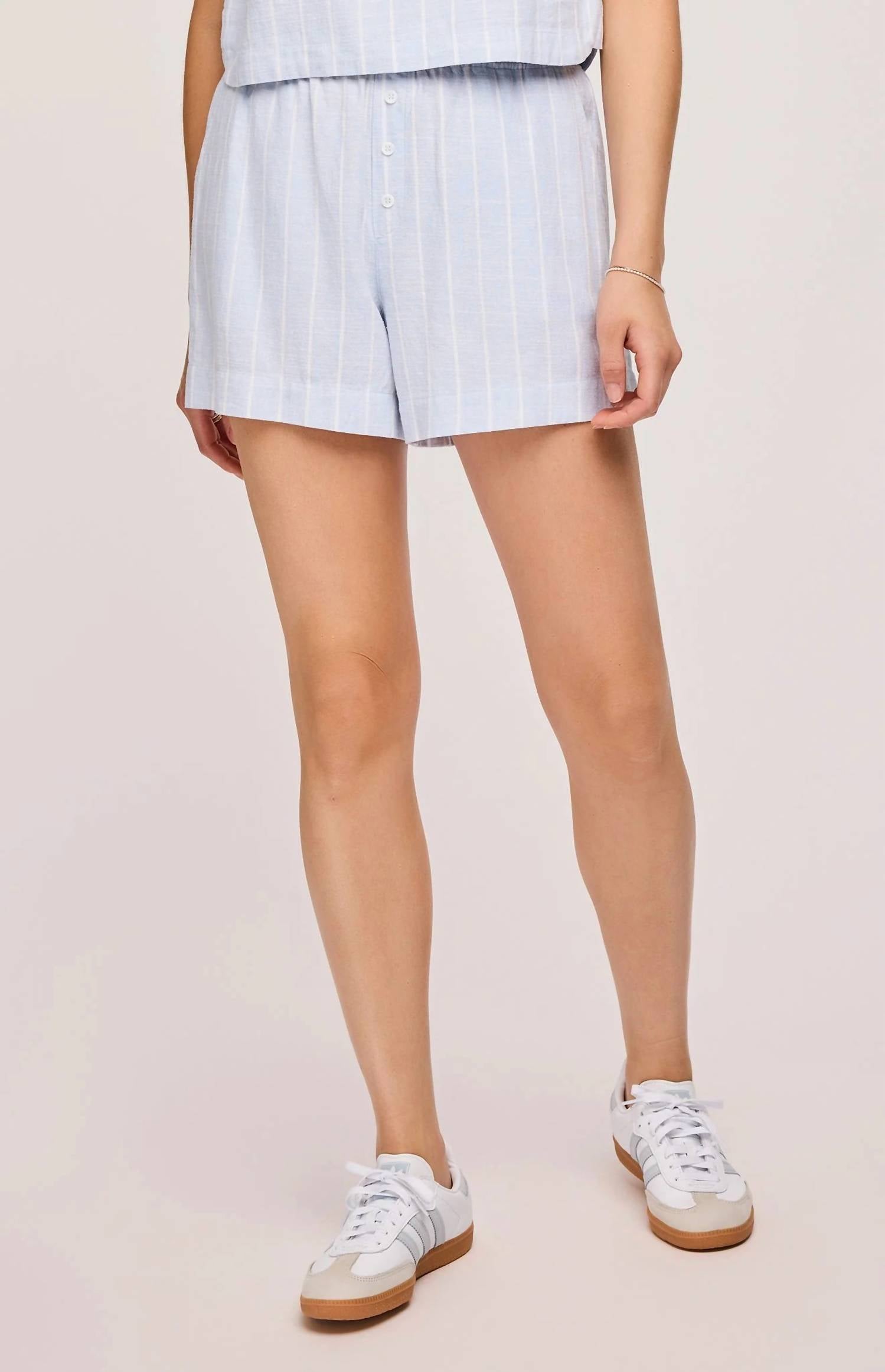 Tuck your favorite tee into these high-waist shorts for a more casual-cool feel. Experience the effortless charm of the Gentle Fawn Linen Shorts, a high-rise piece perfect for everyday wear in Sky Stripe. These shorts feature an elasticated waistband and a faux button fly for ultimate comfort, alongside practical slash and back patch pockets. Crafted from a relaxed fit linen blend of 85% Rayon and 15% Linen, they are designed for easy style. Dry clean only.