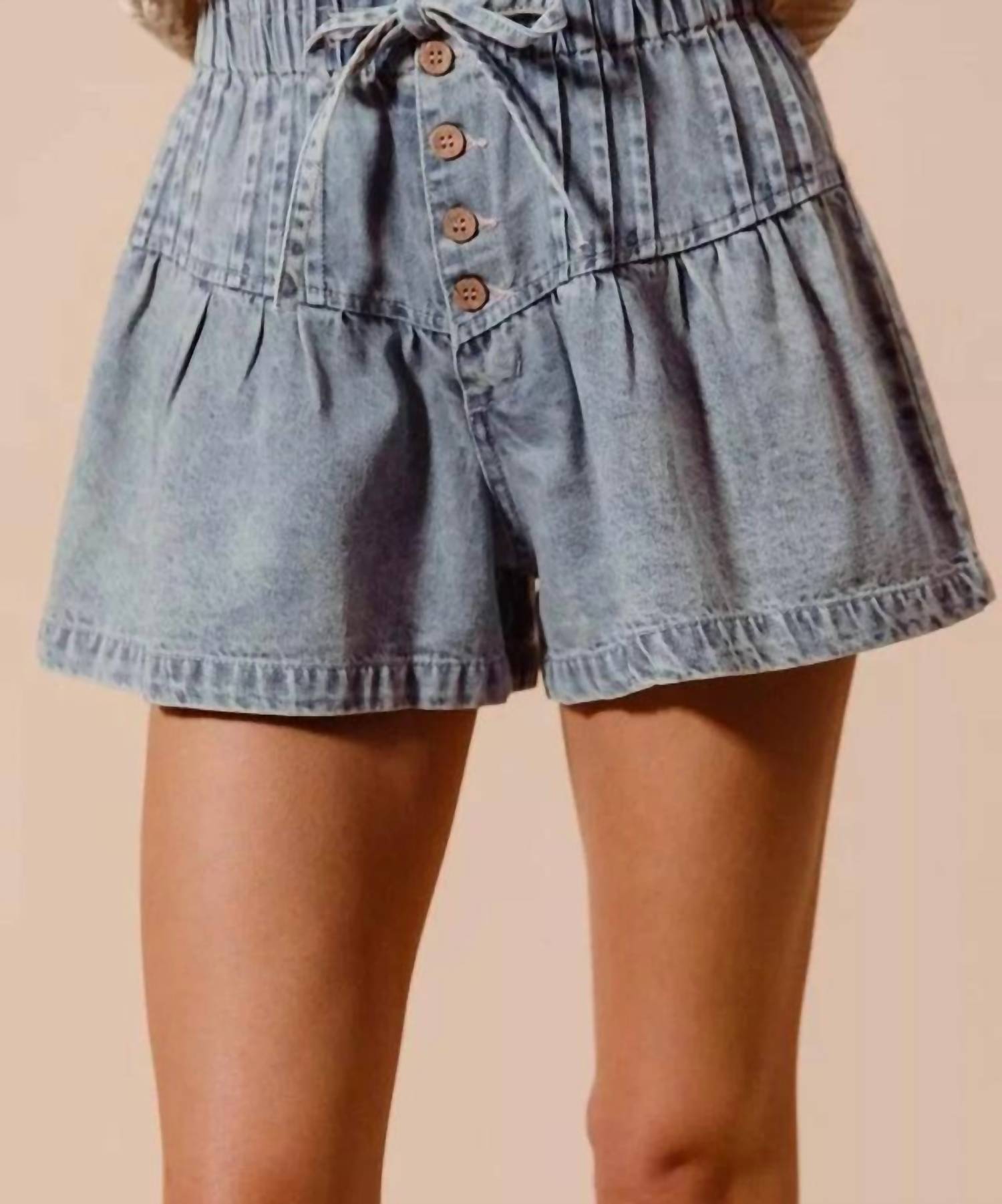 High-waist is here to stay and we especially love this style short. Introducing the Blue Flared Denim Shorts by So Me, expertly crafted for both style and comfort. These shorts feature a slightly stretchy composition of 95% cotton and 5% polyester, with a fashionable flared silhouette and elasticized paperbag waist for a flexible fit. Closure is secured with a button, while the addition of pockets enhances practicality. Ensure longevity by machine washing cold and tumble drying low for easy care.