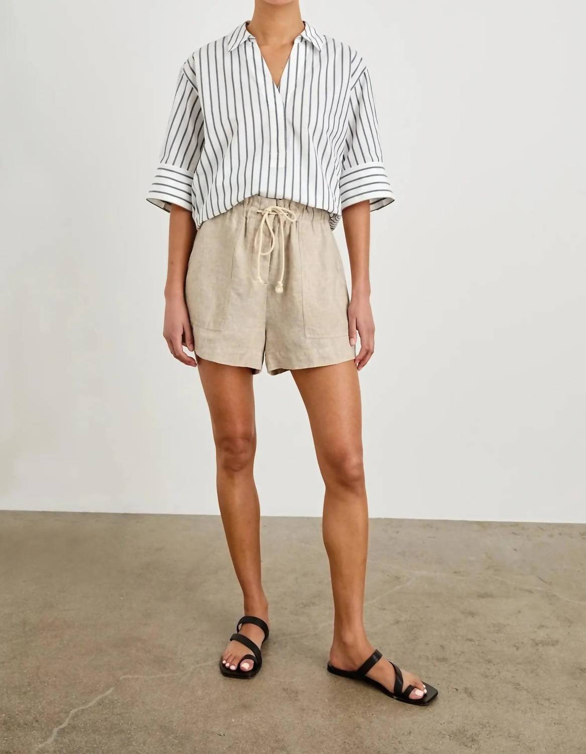 Tuck your favorite tee into these high-waist shorts for a more casual-cool feel. Elevate your summer wardrobe with the Foster Shorts by Rails in a sophisticated Heather Flax hue. Crafted with a high-waist design from a breathable linen material, these shorts offer both comfort and style for sunny days ahead. They feature a practical tie closure and include pockets for added functionality. Perfect for minimalist, vacation-ready looks or Thanksgiving gatherings, and best preserved with dry cleaning.