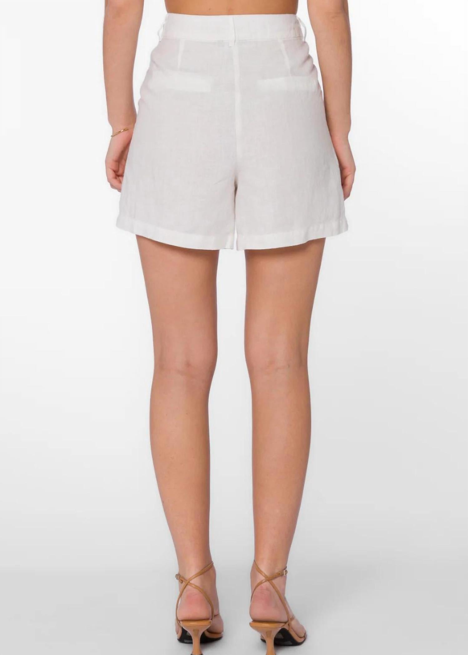 Fit to perfection, we love these high-waist shorts and you will too. Elevate your summer wardrobe with the Kaia Linen Shorts by Velvet Heart, crafted for both style and comfort. These high-waist shorts in classic white feature a flattering pleated front and convenient side slanted pockets. Made from 100% Linen with a secure zipper and hook and eye closure, they offer a minimalist aesthetic perfect for vacation or Mother's Day. Imported and easy to care for, simply machine wash warm to maintain their timeless appeal.