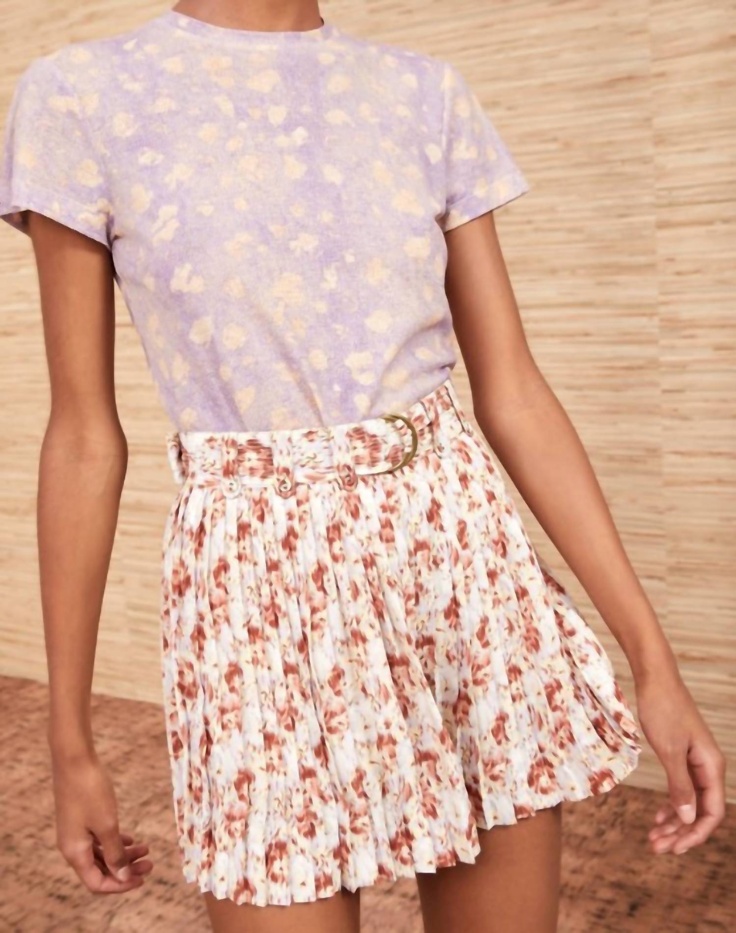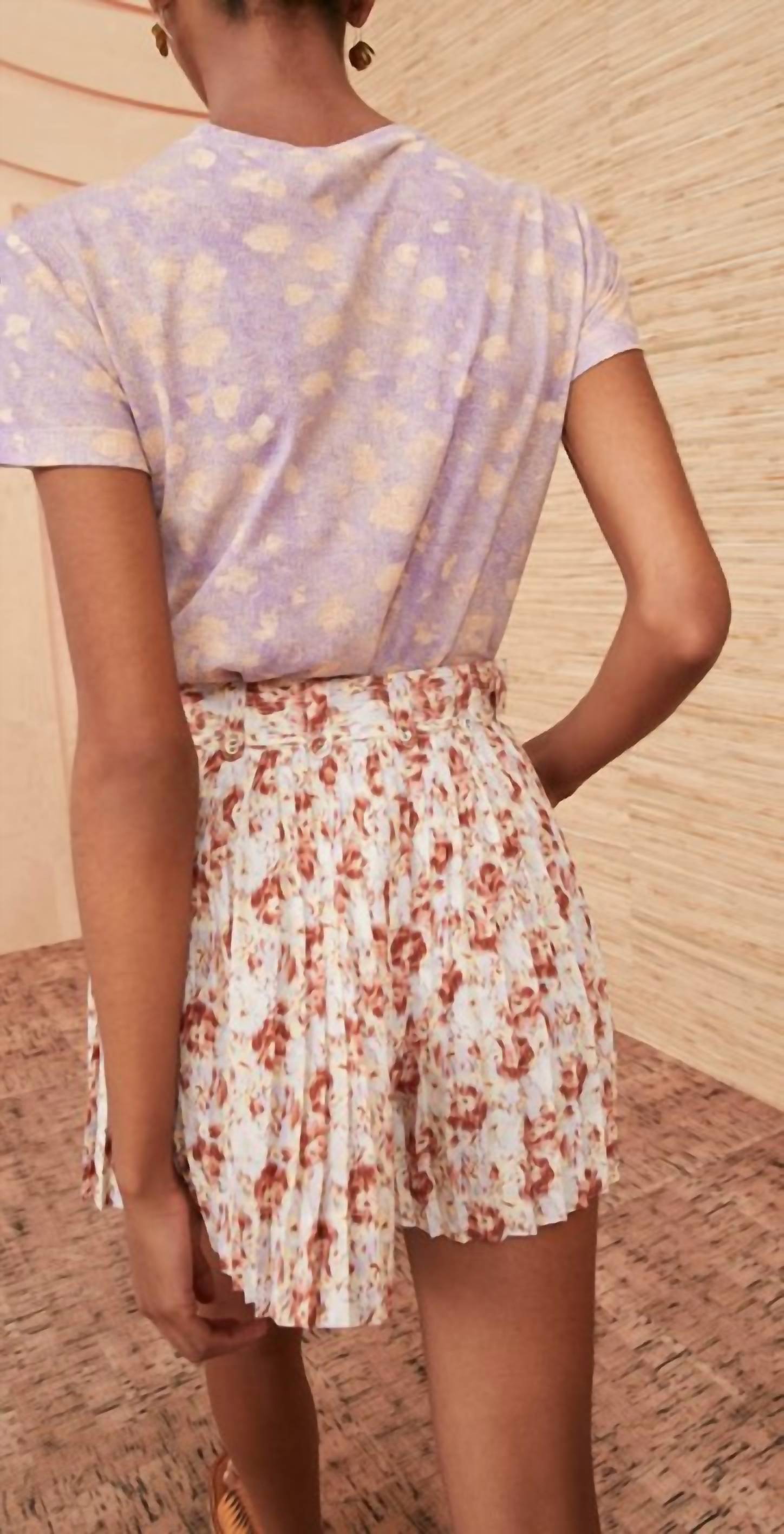 The Margot Short is defined by soft pleats. Fixed waistband. Floral printed shorts. High-waist. Removable belt. Finished with an antique brass D-ring. 100% Silk.