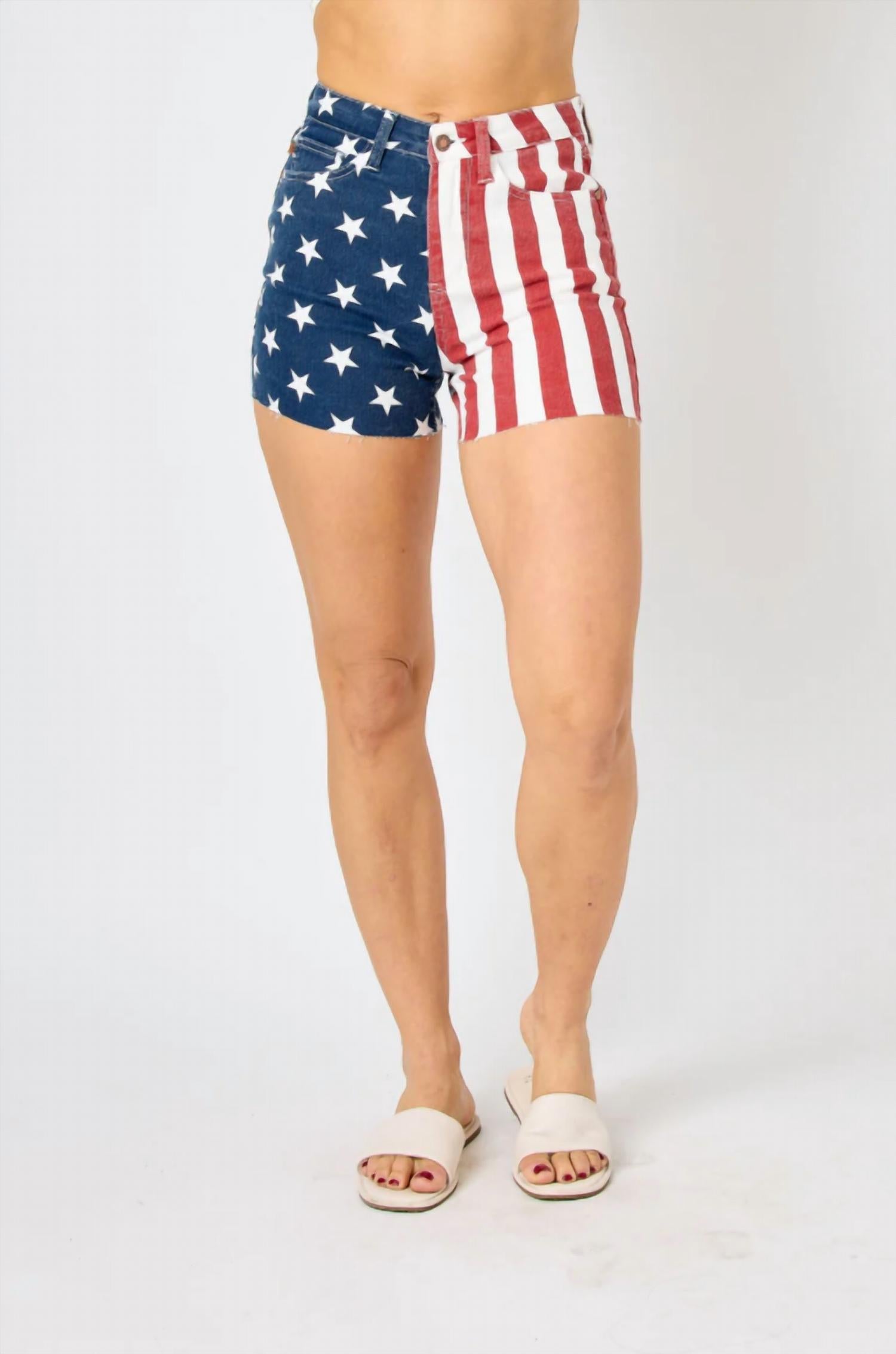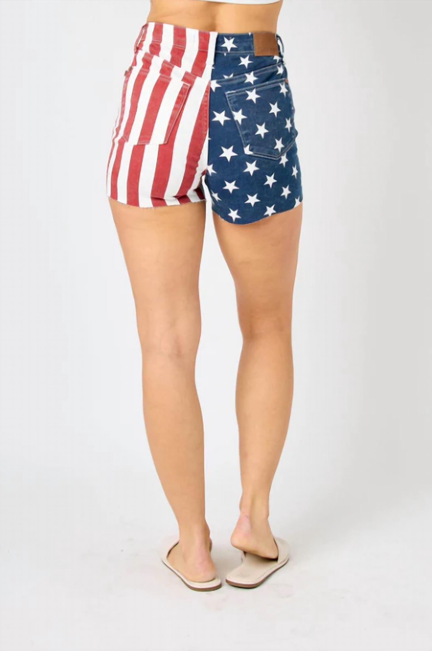 Fit to perfection, we love these high-waist shorts and you will too. Embrace patriotism featuring a striking red, white, and blue design. Sport a unique pattern with a red and white striped left leg and a blue with white stars right leg. Crafted from comfortable cotton with a 5-inch inseam. Equipped with pockets and a secure button closure. Designed for both style and utility. Care for them easily through machine wash and tumble dry maintenance.