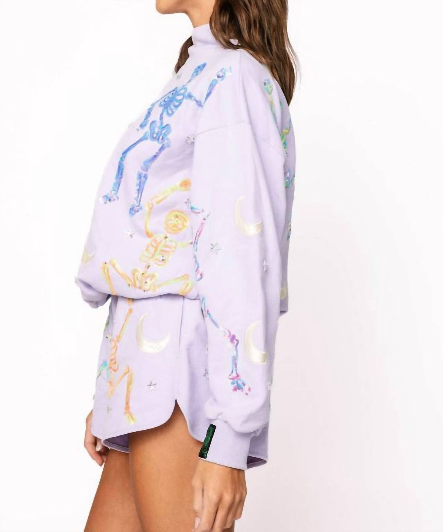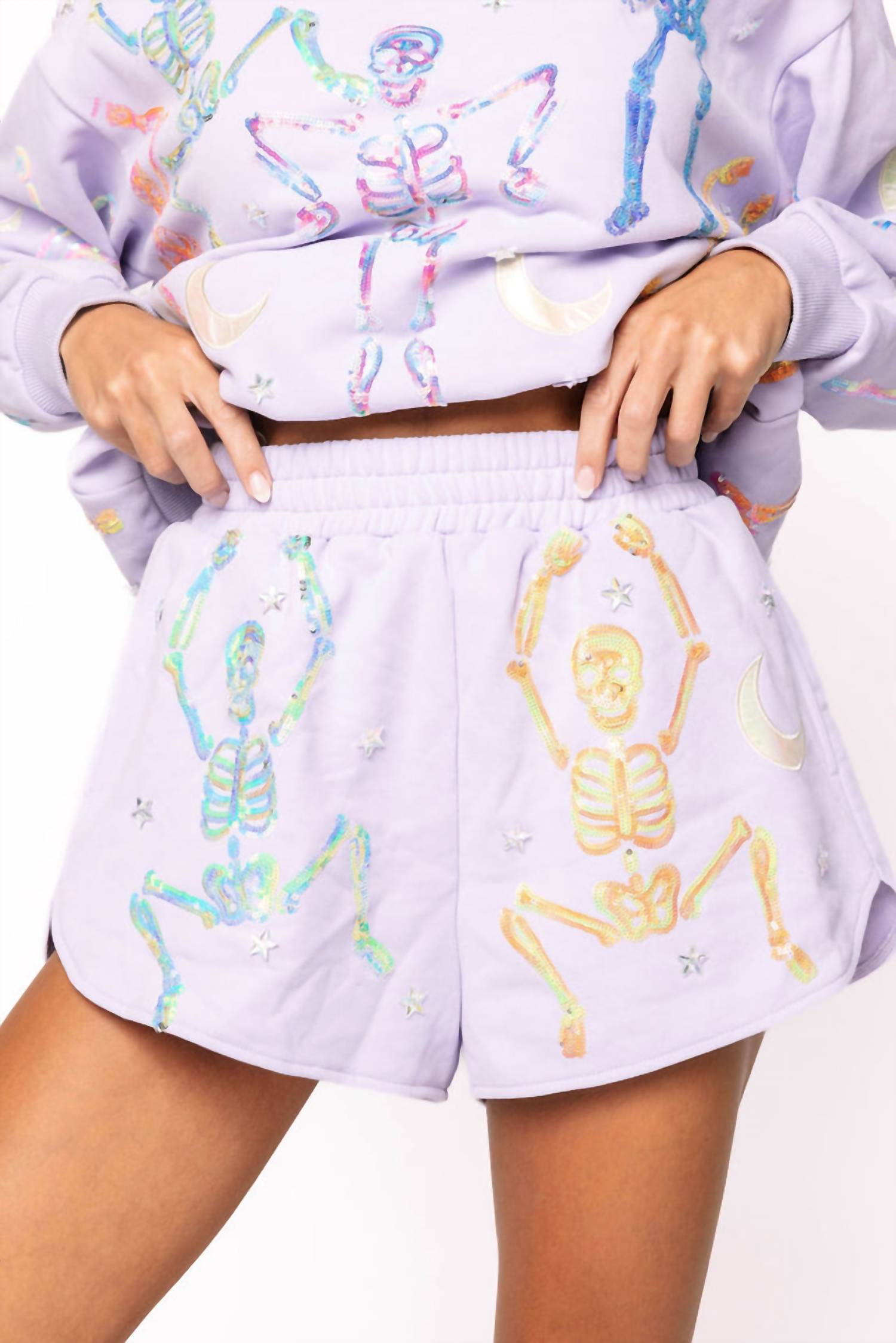 Tuck your favorite tee into these high-waist shorts for a more casual-cool feel. Make a bold entrance this spooky season with the Queen of Sparkles Lavender Multi Dancing Skeleton Short. This playful skort features a graphic pattern with glimmering sequins, perfect for streetwear enthusiasts looking to stand out at holiday parties. Styled for women, it offers practical pockets and a high waist with a convenient pull-on closure. Care instructions: Hand wash and lay flat to dry for best results.