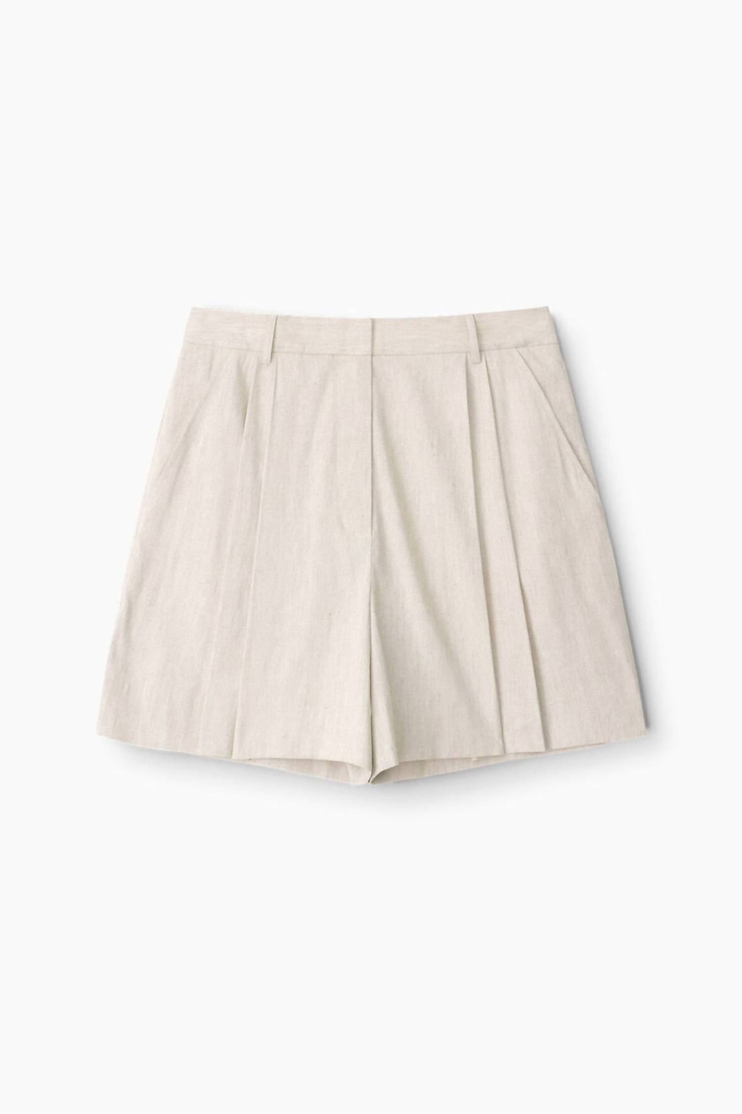 High-waist is here to stay and we especially love this style short. Meet the Cruz Linen Short by STAUD, a tailored piece in a solid natural hue designed for comfort and breathability. With its high waist and flattering pleated design, this short is crafted from a linen blend comprising 53% Linen, 45% Viscose, and 2% Spandex, with a lining of 100% Cotton. It features a convenient zip closure and back welt pockets for added functionality. For optimal care, ensure these shorts are dry cleaned only. Model is 5'10" and wears a size 4.