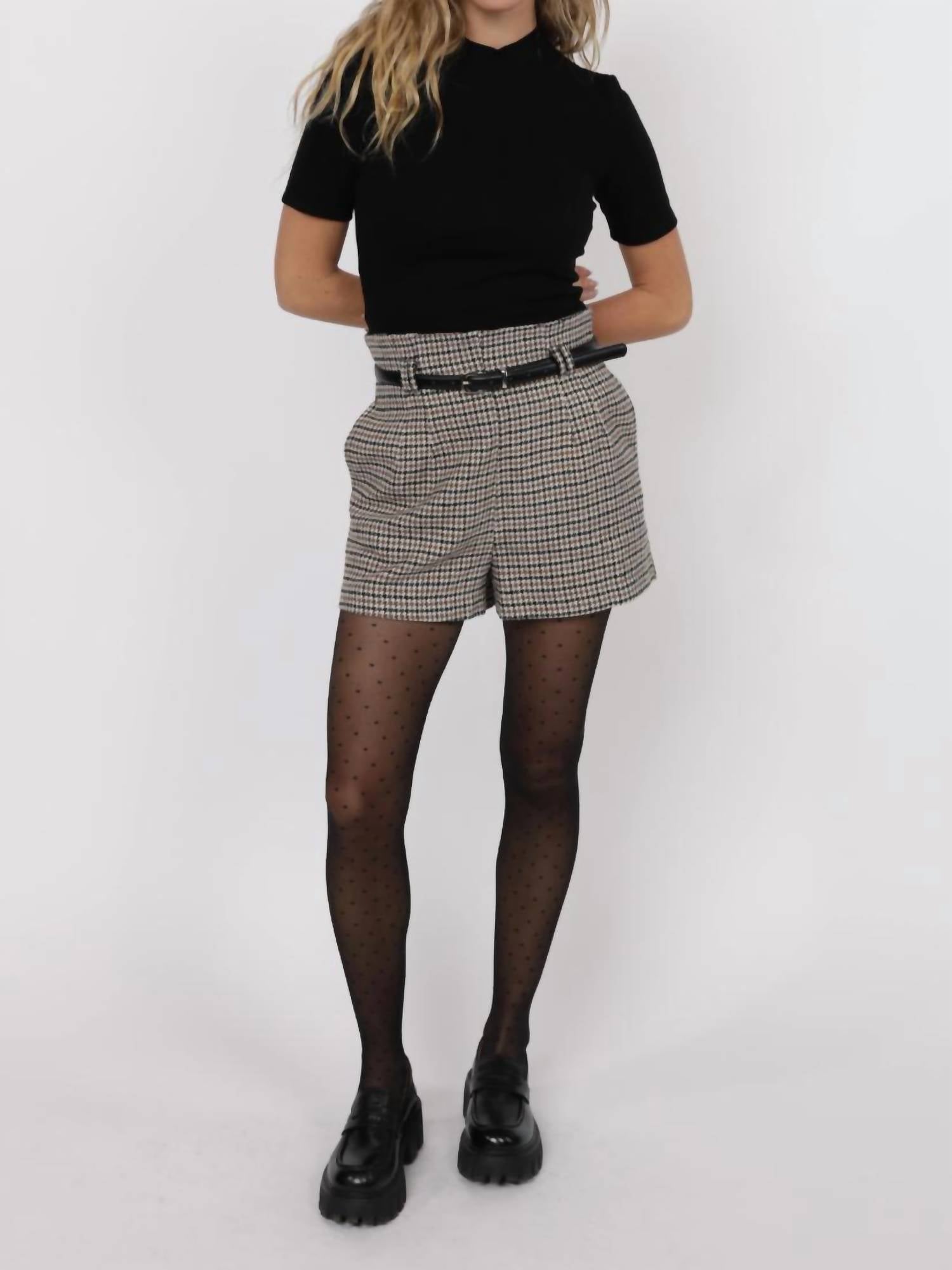 High-waist is here to stay and we especially love this style short. Elevate your fall wardrobe with the Memorabilia High Waist Belted Shorts by SAGE THE LABEL, showcasing a classic houndstooth pattern in black multi hues. These women’s shorts are high rise and composed of 100% polyester, providing a structured yet relaxed fit. The design includes a slim black belt, side pockets, and back welt pockets, all secured with a practical zip closure. For easy care, machine wash cold and lay flat to dry.