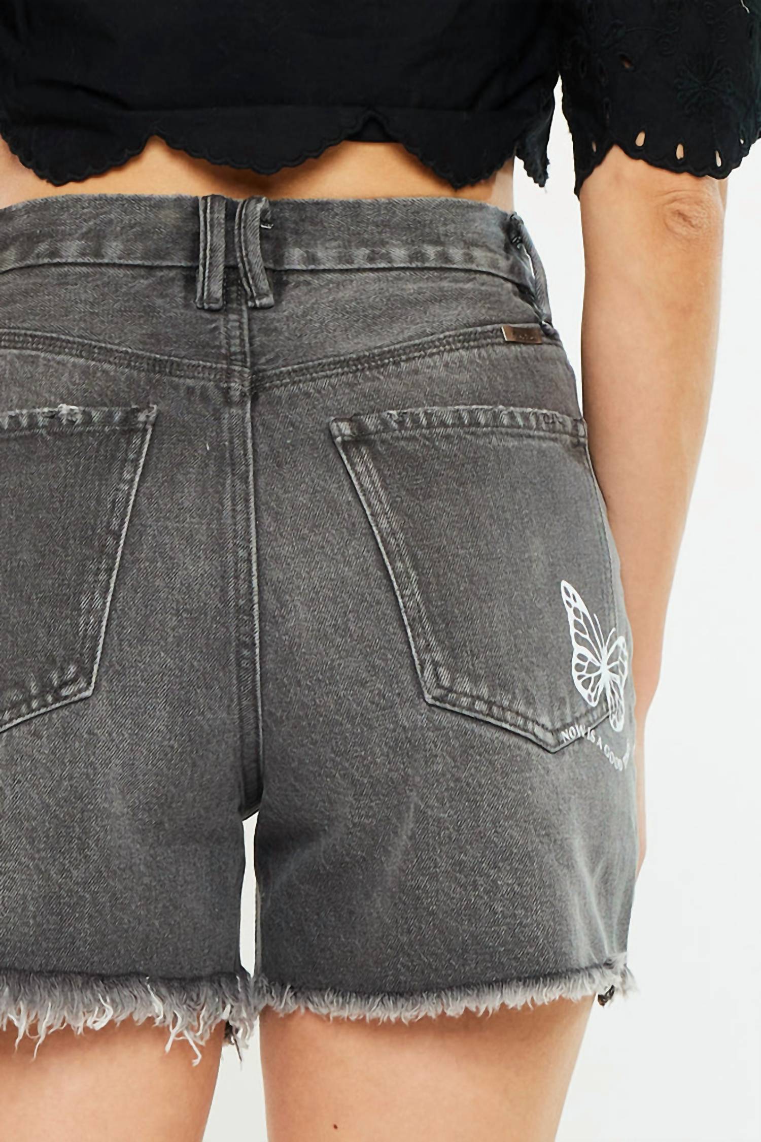 Meet the Ariya Ultra High Rise 90's Boyfriend Shorts by KanCan, crafted in 100% cotton for a trendy, casual vibe. This women's piece, in a unique Grey Butterfly color, features a high 12" rise and a 4.5" inseam, offering a relaxed fit with a button closure for added comfort. Designed with a 5-pocket style, these shorts are perfect for summer outings or casual home wear, featuring light fading, whiskering, and a distinctive frayed hem. Please note the rigid stretchiness level for an authentic vintage look.