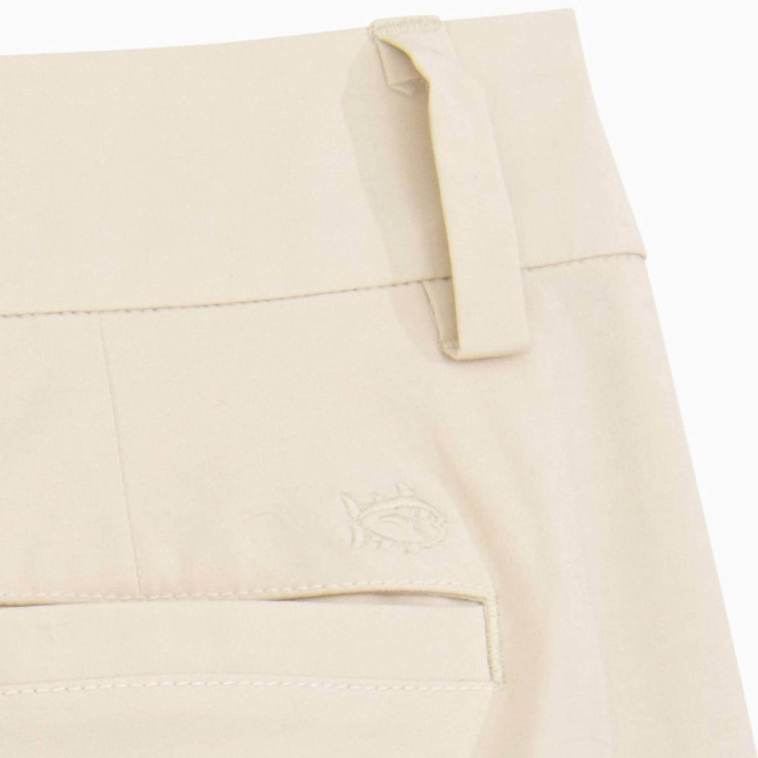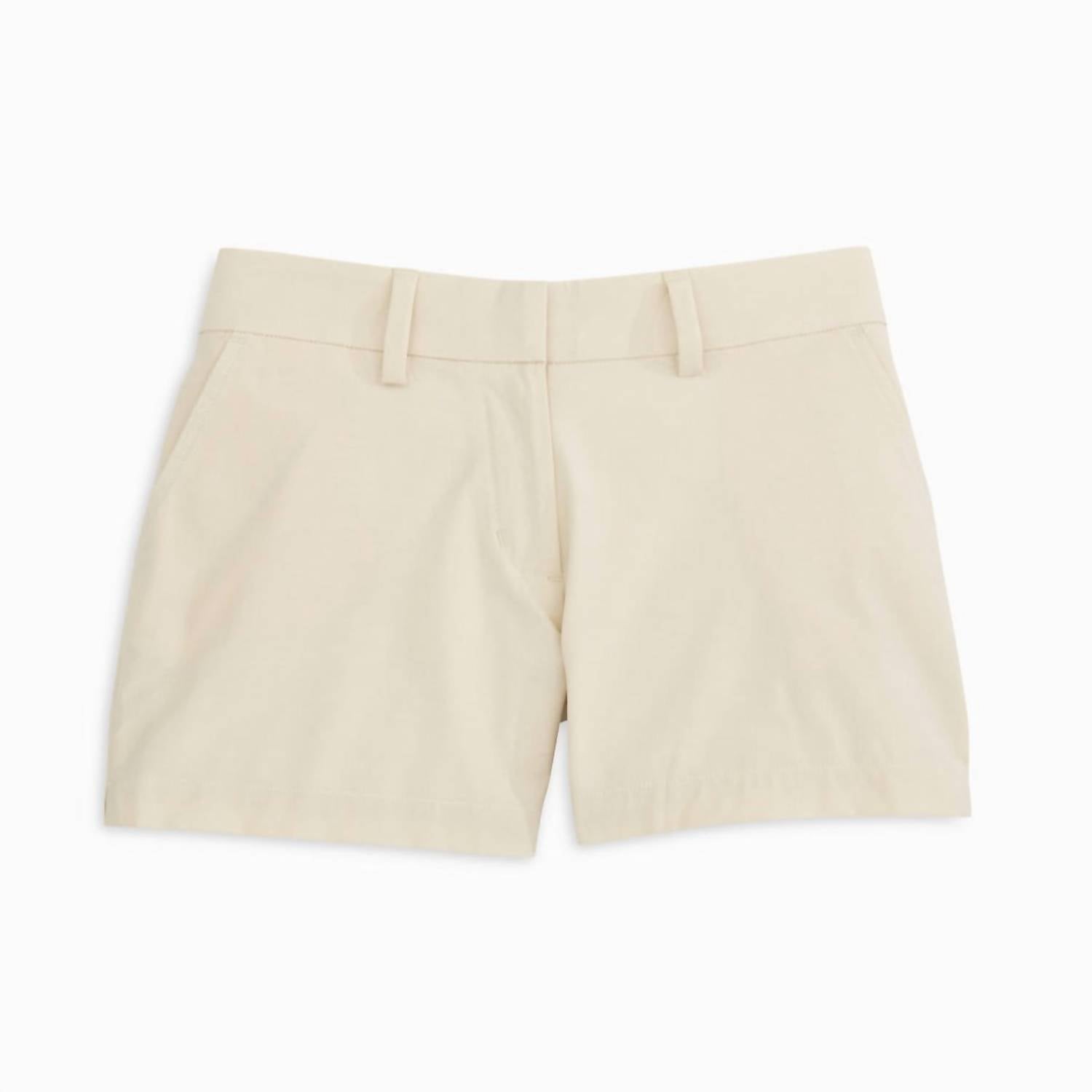 High-waist is here to stay and we especially love this style short. Elevate your summer wardrobe with the Southern Tide Women's Inlet 4" Short in a chic stone color. Designed for vacation and casual wear, these high-waisted shorts are crafted from a nylon blend featuring stretch fabric for ease of movement. With a stylish 4-inch inseam, they provide comfort and practicality with slanted side pockets, a welt pocket at the back, and a hidden button closure with an exterior hook and bar and coil zip fly. The shorts boast moisture-wicking technology, UPF 50 protection, and thoughtful details like side slits and embroidery. Care is simple with machine wash.