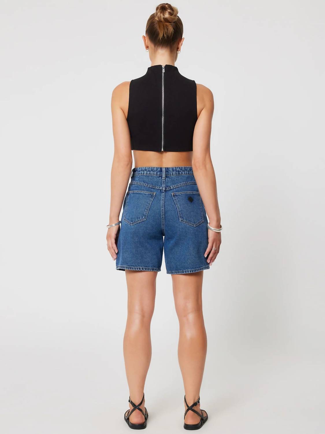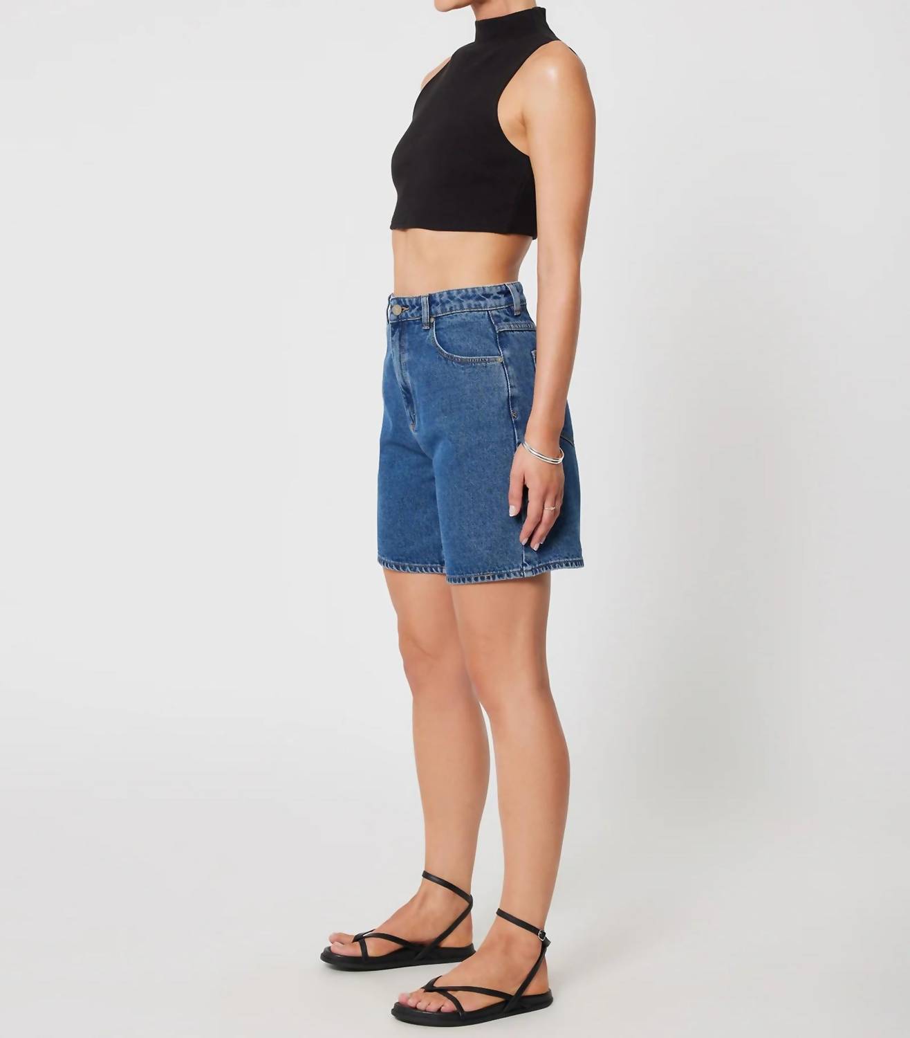 Fit to perfection, we love these high-waist shorts and you will too. Elevate your casual wardrobe with the Carrie High Waist Jean Shorts by Abrand Jeans, a perfect choice for spring festivals or laid-back summer holidays. These mid-blue jean shorts boast a classic 5-pocket styling and a trendy high-waisted silhouette. Composition includes 91% cotton, 5% viscose, and 4% polyester, providing a comfortable cotton blend. Features a zip fly with button closure and finished with a back logo patch. Care instructions recommend machine washing.