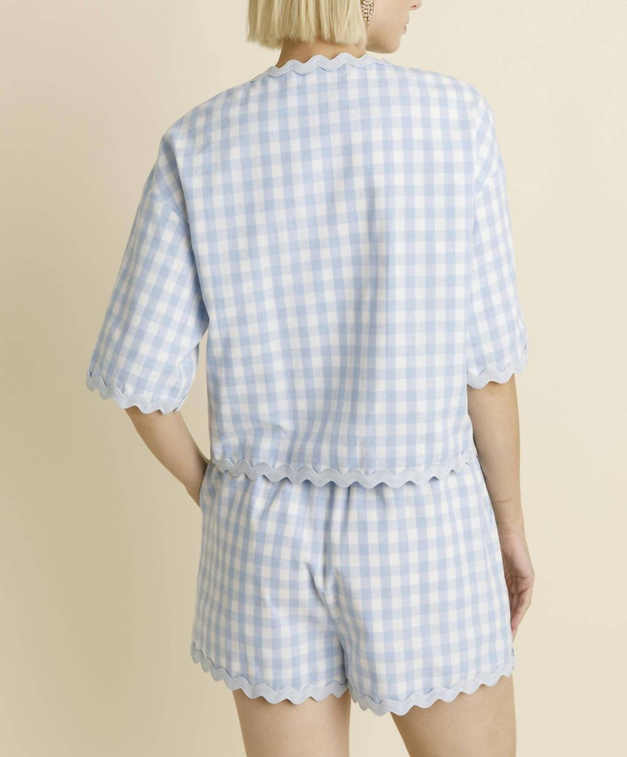 High-waist is here to stay and we especially love this style short. Elevate your vacation wardrobe with the Gingham Shorts by Aureum, perfect for embracing 90s fashion trends. Made from non-stretch cotton weave, these high-waisted shorts feature a charming gingham pattern in blue and are fully lined for comfort. Enjoy the playful ric-rac trim detail at the edges and adjust the fit with the front tie closure. Practical and stylish, these shorts include pockets for added convenience. Model is 5'9" and is wearing a size small.